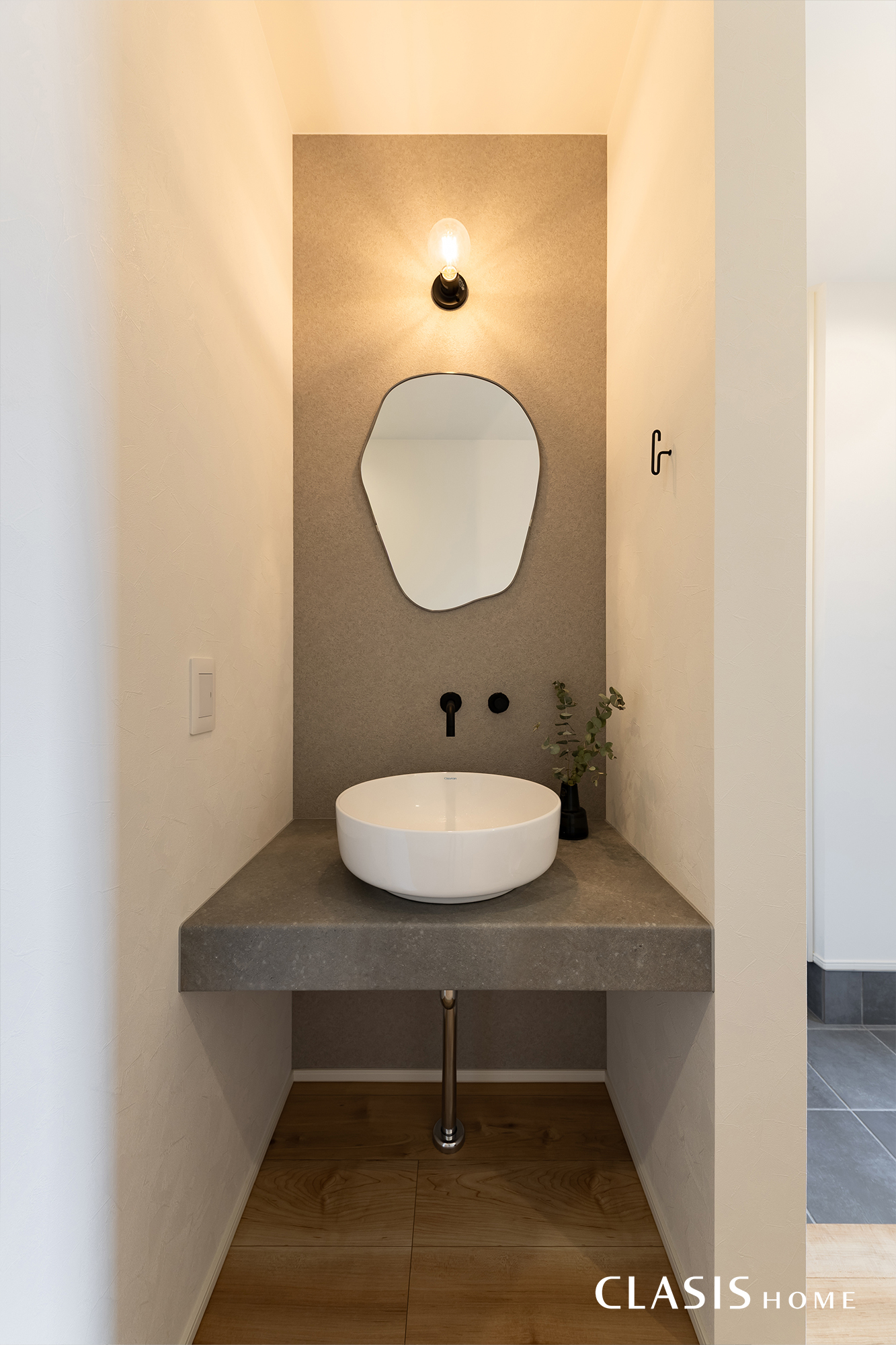 玄関ホールの一角に造作手洗いを配しました。モノトーンで統一した手洗いは、ボウルをホワイトにすることで軽やかさを感じさせる仕上がり。