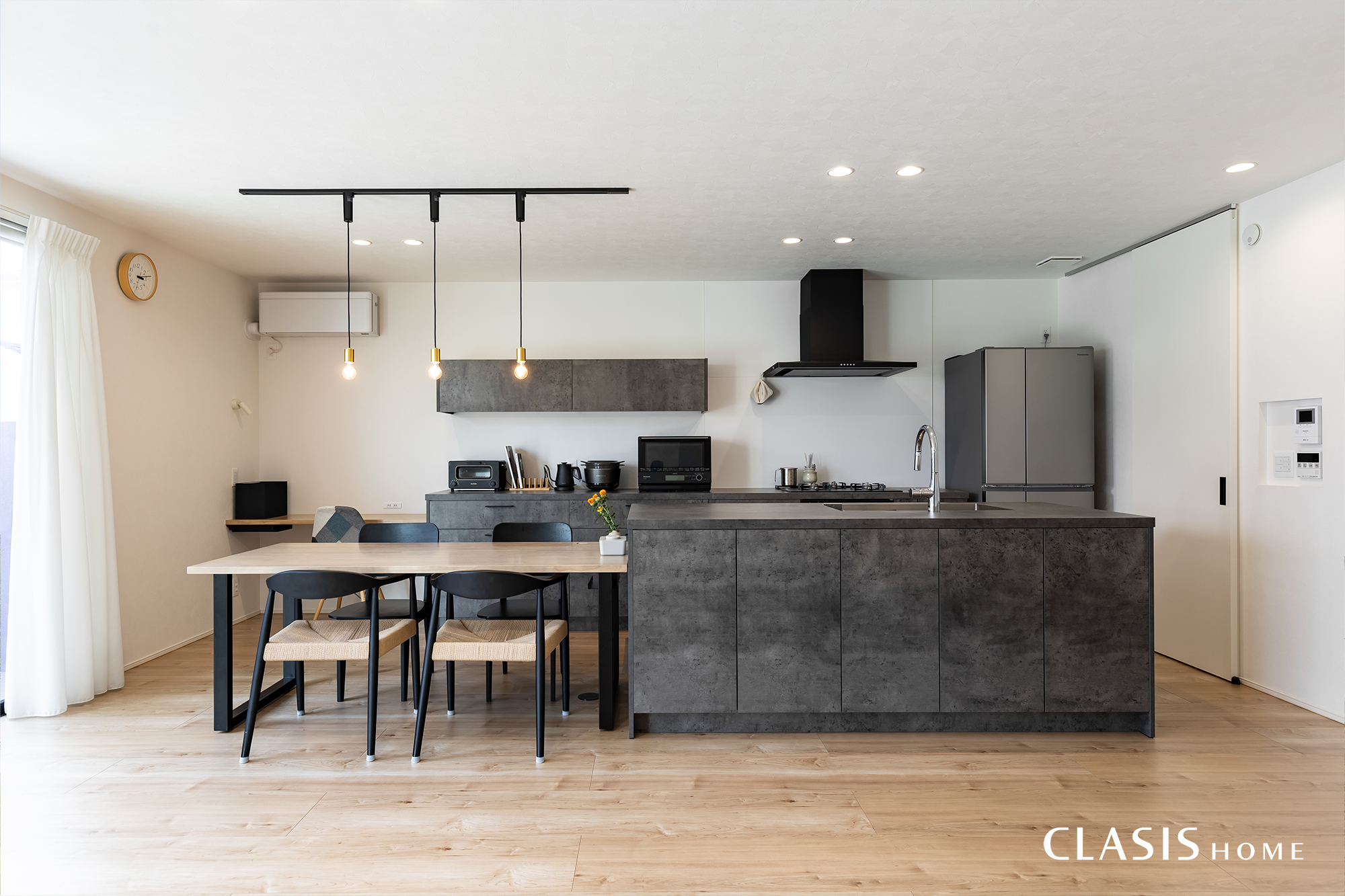 ダイニングキッチンはグレーを主役としたナチュラル&モダンな雰囲気に。ダイニングの照明は雰囲気を変えられるようにダクトレールタイプにしています。照明の種類や配置を変えたり、植物を吊るしたりするなど、様々なアレンジが可能です。