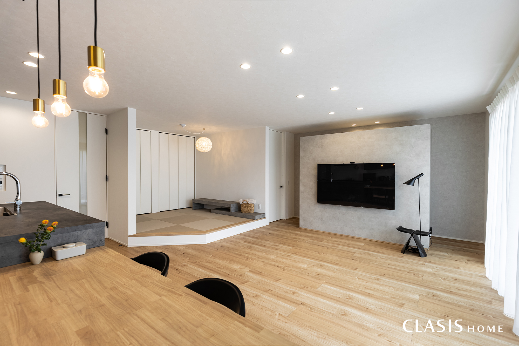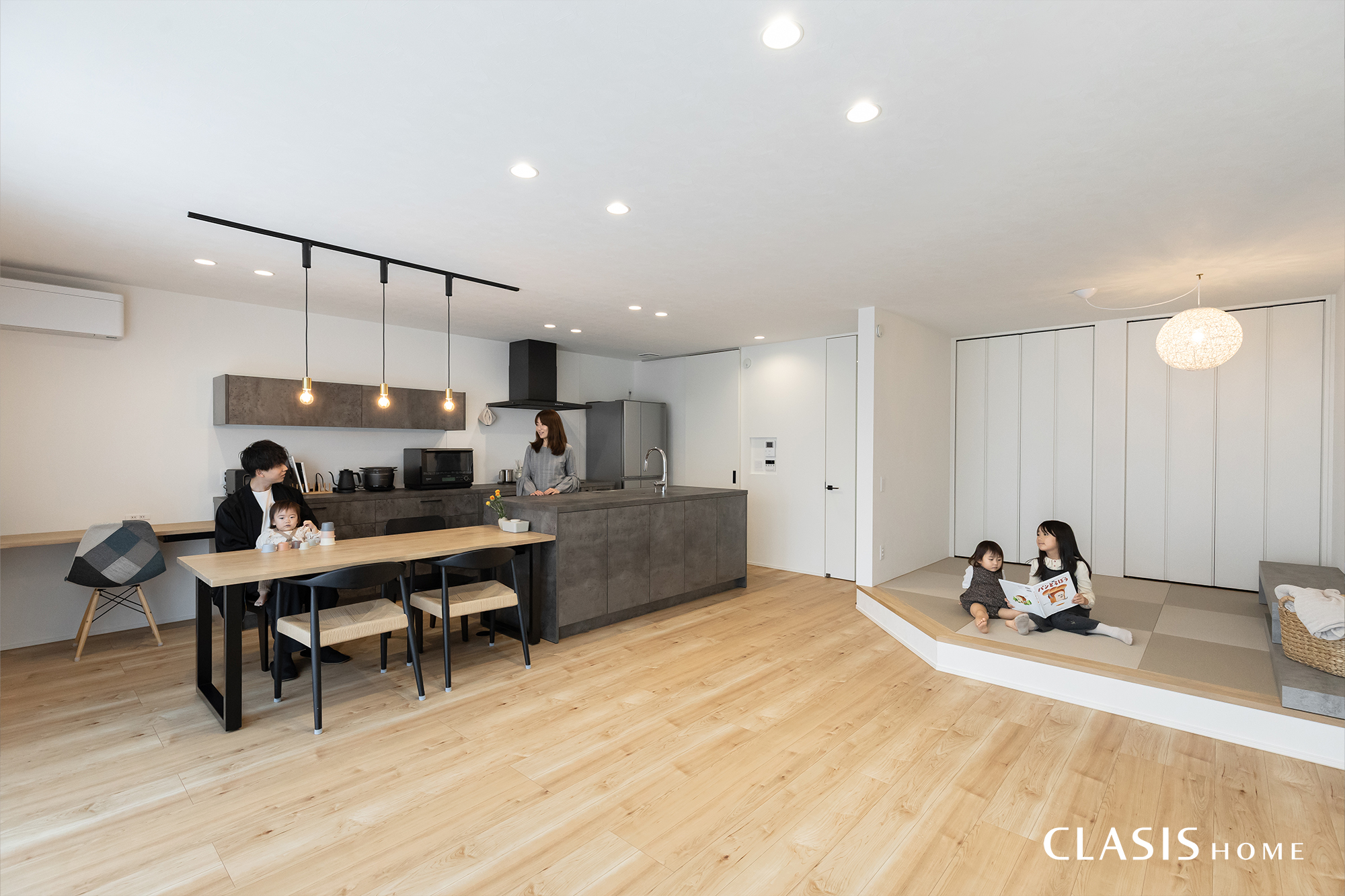 温かみのあるメープル材と白のクロスを基調としたシンプルなコーディネートのLDK。小さなお子様の遊び場やお昼寝スペースに便利な小上がりの畳スペースを設けています。