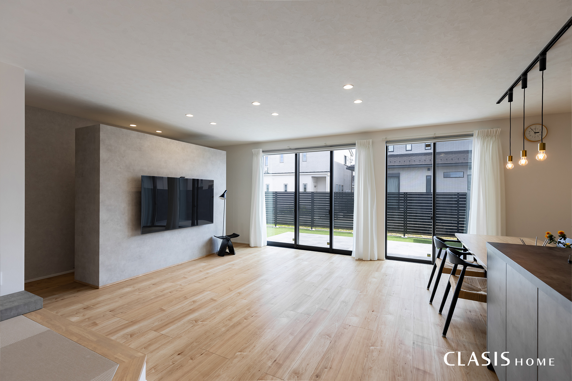 リビングのテレビ面にはアクセントウォールを造作しました。背面が収納になっているためテレビボードや収納BOXを置く必要がなく、空間をすっきりと広く見せられます。