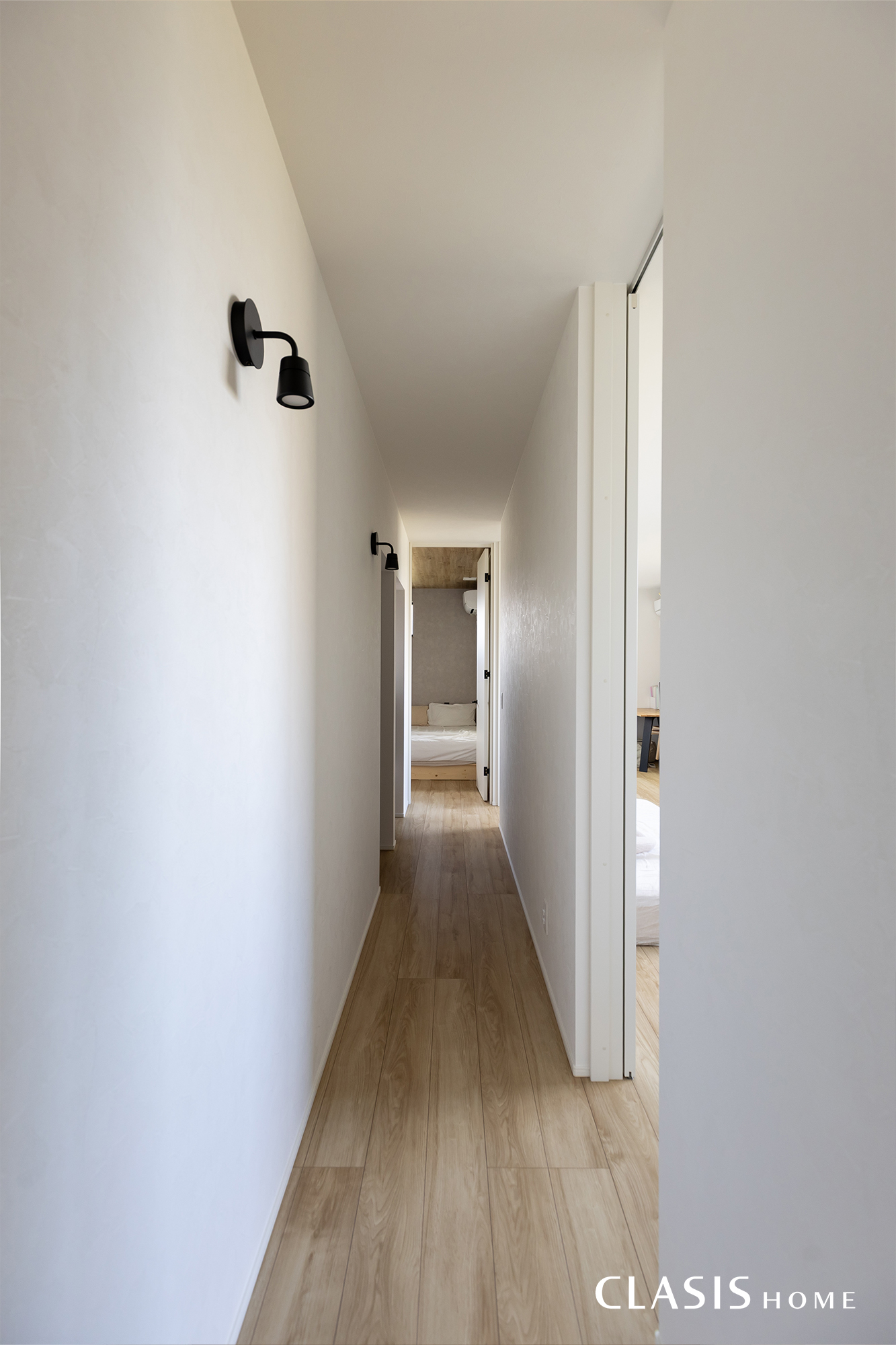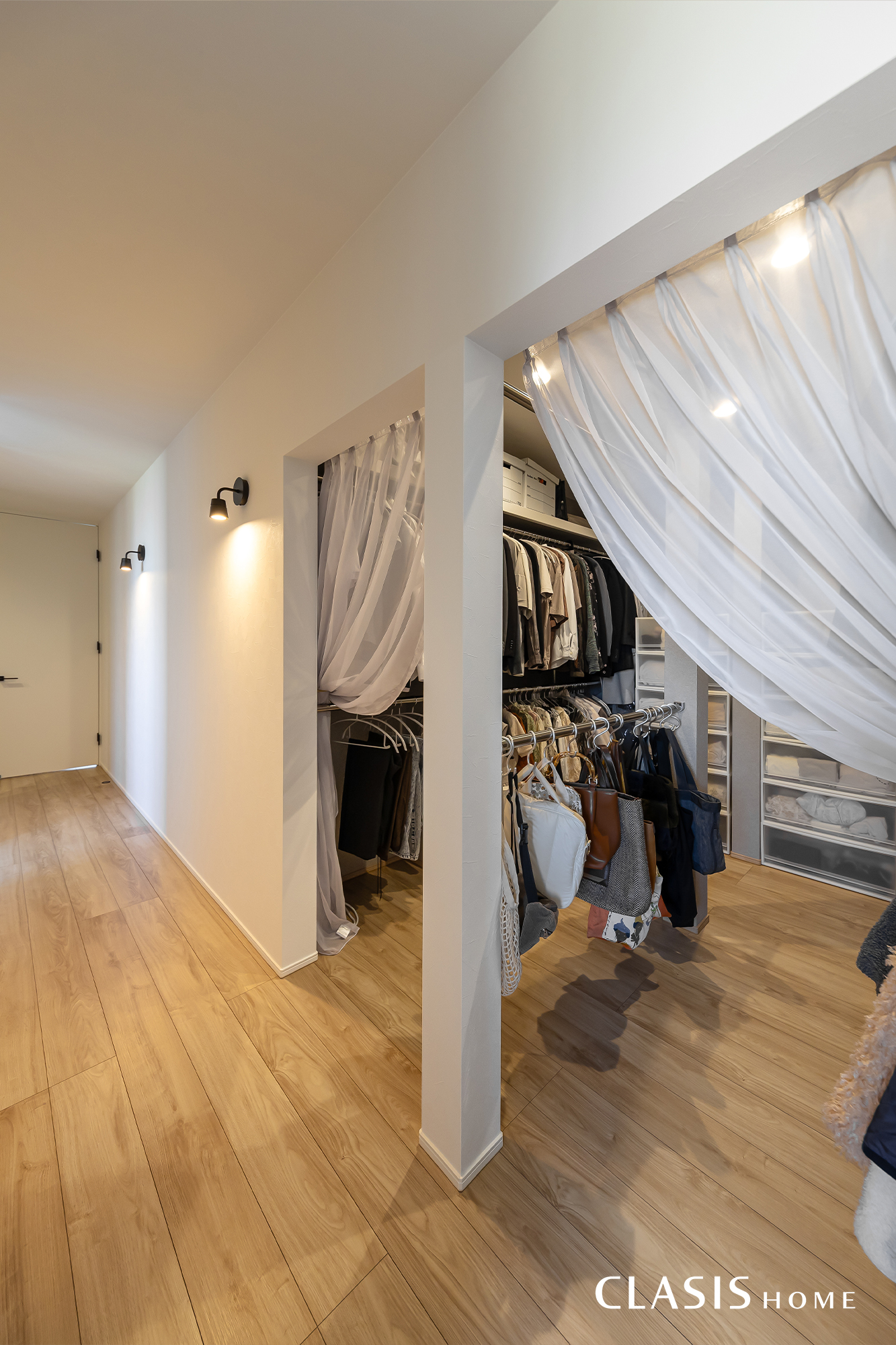 長い廊下はダウンライトを排除し、ブラケットライトを用いた照明プランにしました。ファミリークローゼットはコの字型に使用できるよう設計し、スペースを余すところなく活用できます。