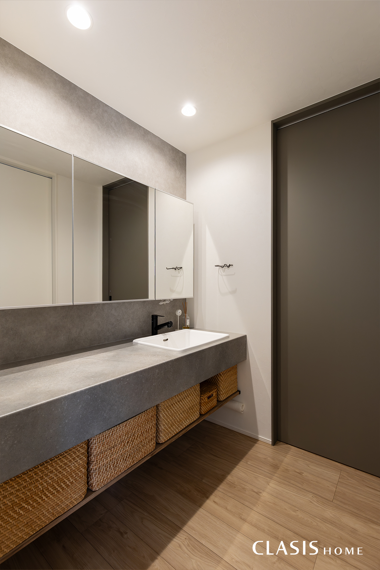 洗面室はシンプルなコーディネートで収納量にゆとりを持たせました。忙しい朝でも家族で並んで使える横長サイズのため、身支度が効率よく行えます。