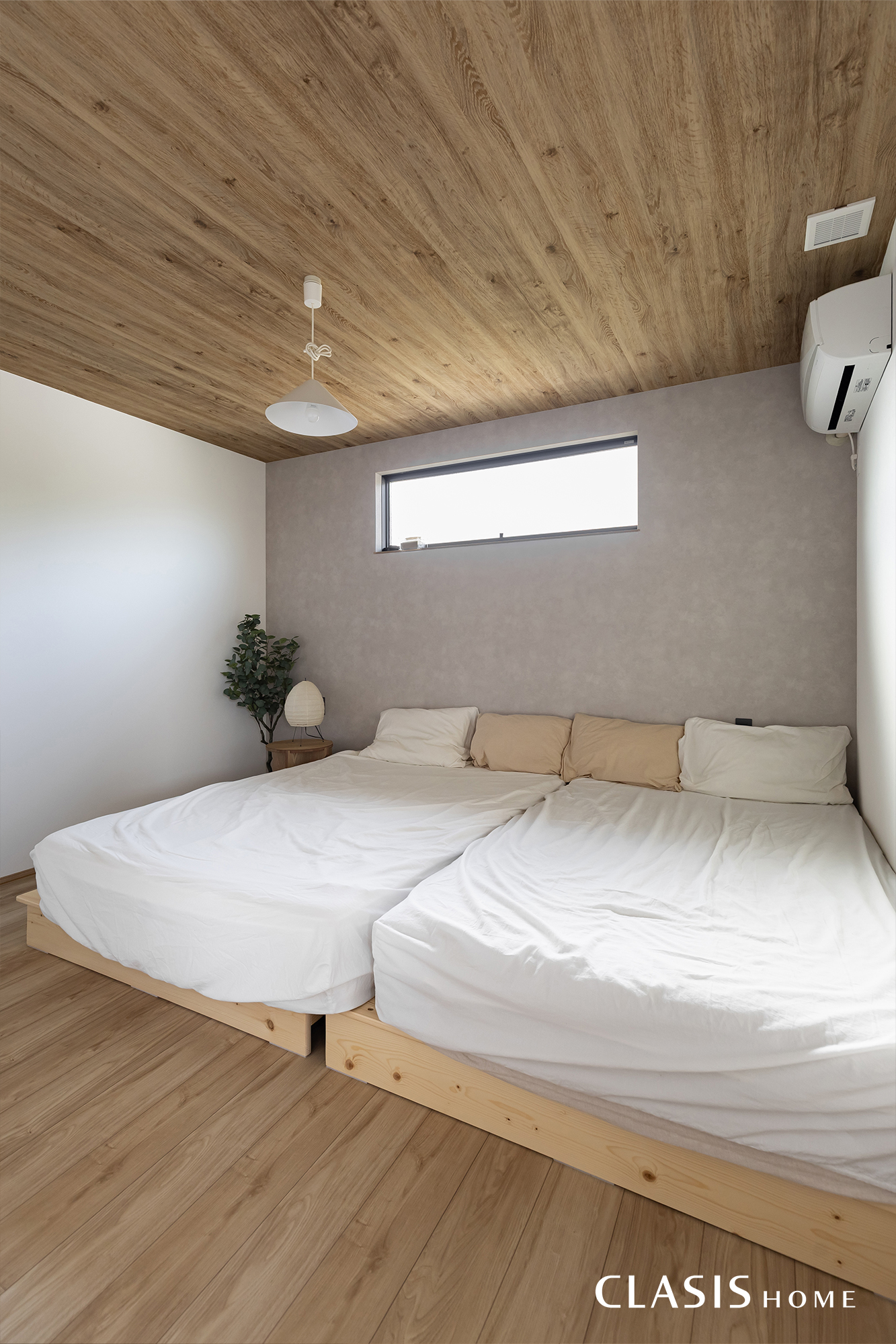 寝室は木目×グレーのアクセントクロスでより落ち着いた印象に。