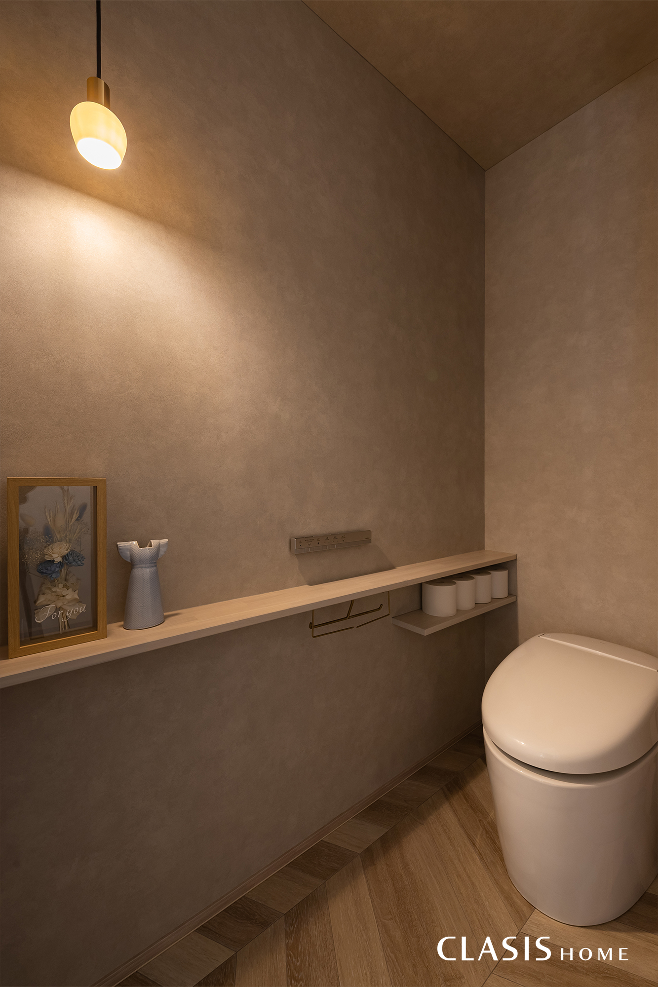 グレーのクロスにヘリンボーン柄の床材を合わせ、素朴な温かみの中に可愛らしさを忍ばせた玄関側トイレ。床材にはお手入れのしやすいフロアタイルを採用しています。