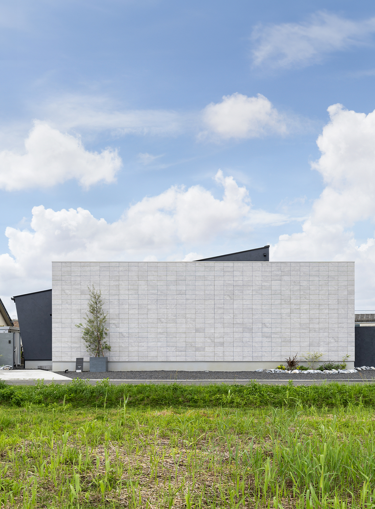 ネイビーの塗り壁をベースに、正面にライトグレーのアクセントタイルでインパクトを持たせた平屋のファサード。直線と斜線が組み合わさったデザインに無機質な素材を採用することで、従来の住まいのイメージを刷新する外観としました。