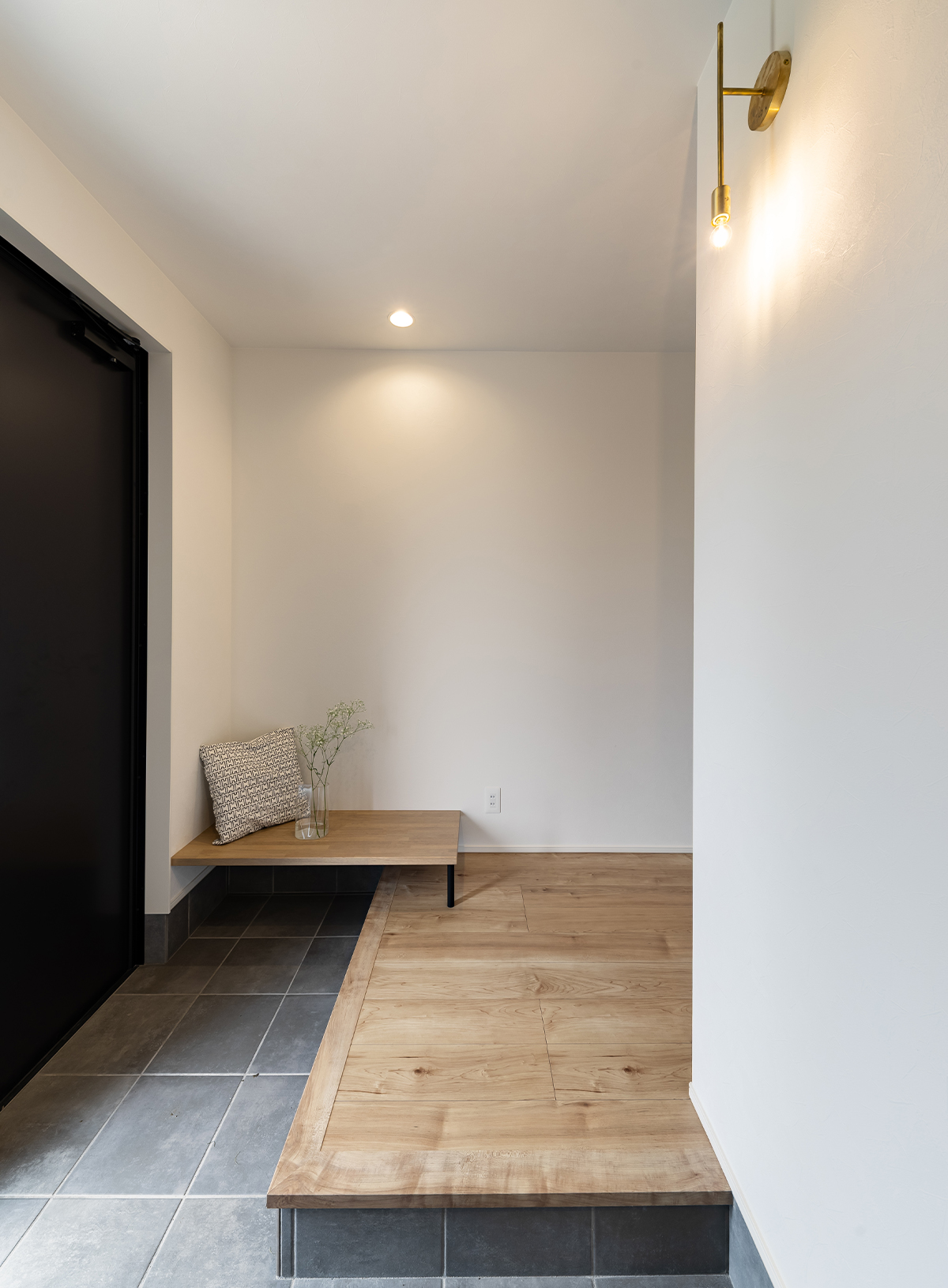 玄関ホールにはシューズクローゼットと造作ベンチを設けました。造作のベンチの脚はアイアンで製作してスッキリしたデザインに。ブラックの差し色が空間を引き締めるアクセントです。