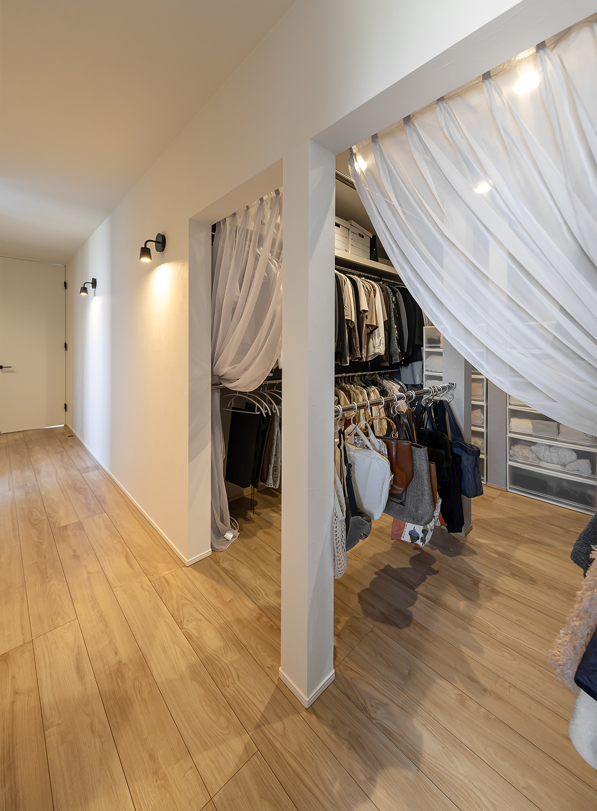 長い廊下はダウンライトを排除し、ブラケットライトを用いた照明プランにしました。ファミリークローゼットはコの字型に使用できるよう設計し、スペースを余すところなく活用できます。