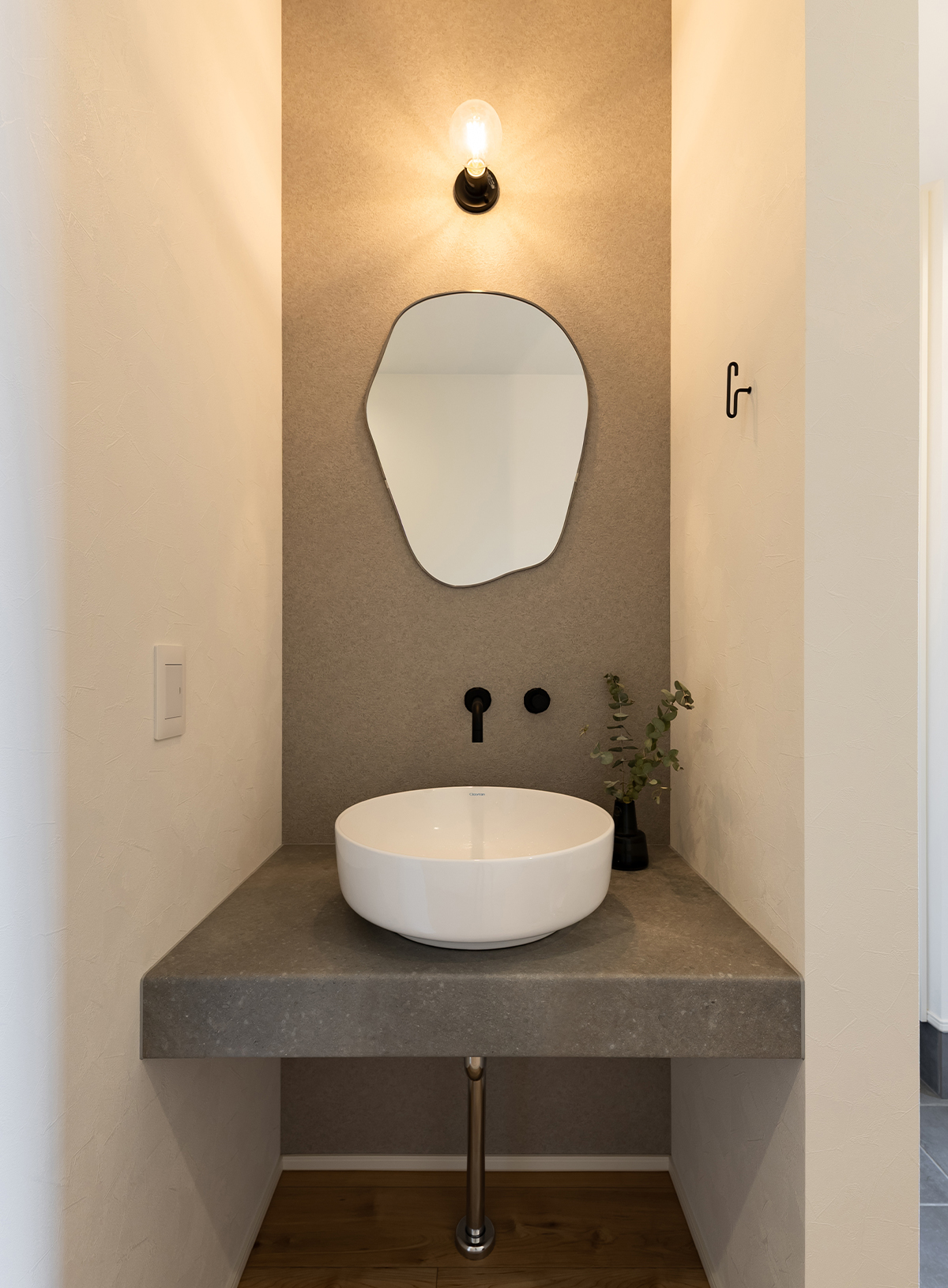 玄関ホールの一角に造作手洗いを配しました。モノトーンで統一した手洗いは、ボウルをホワイトにすることで軽やかさを感じさせる仕上がり。
