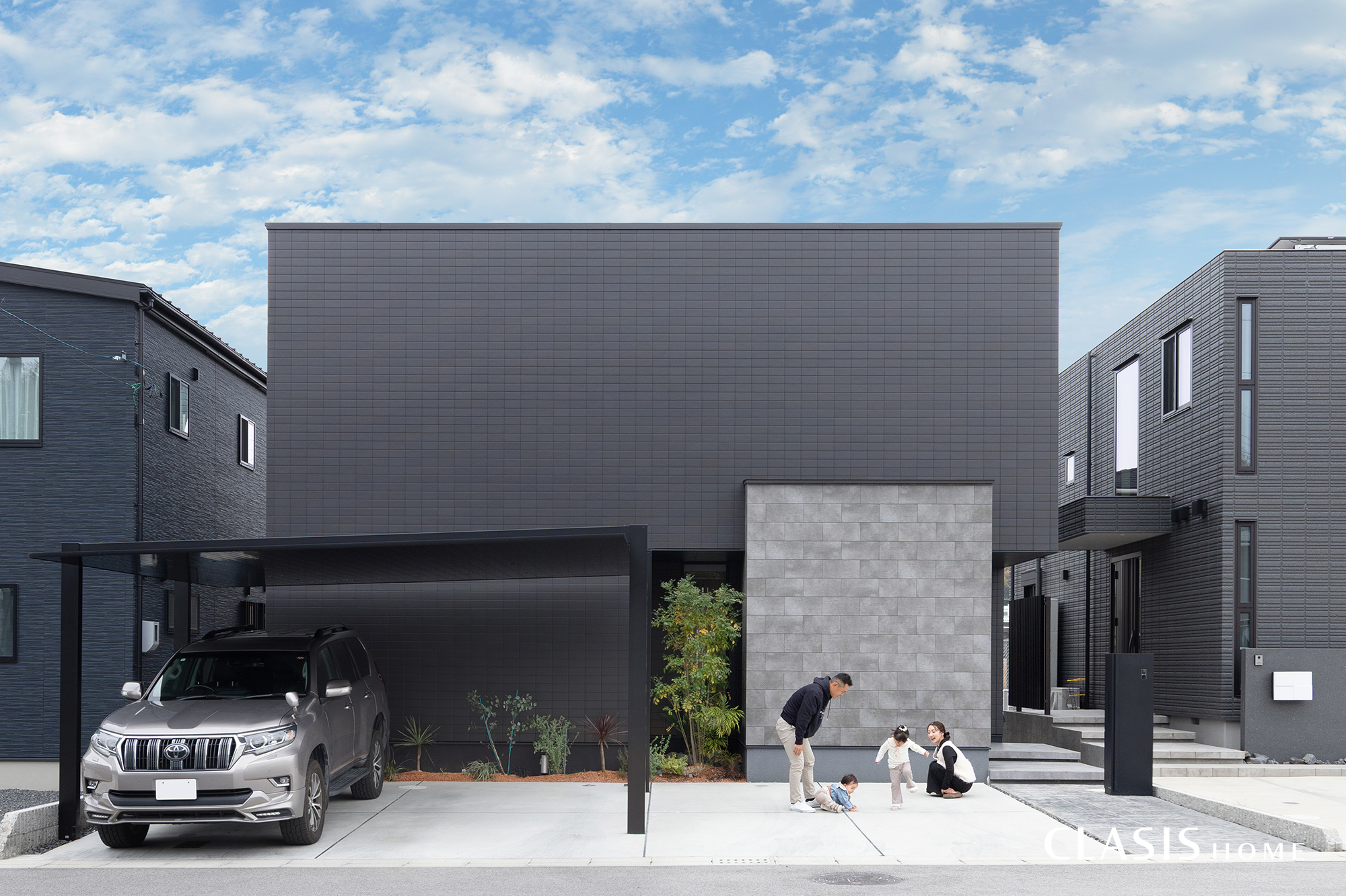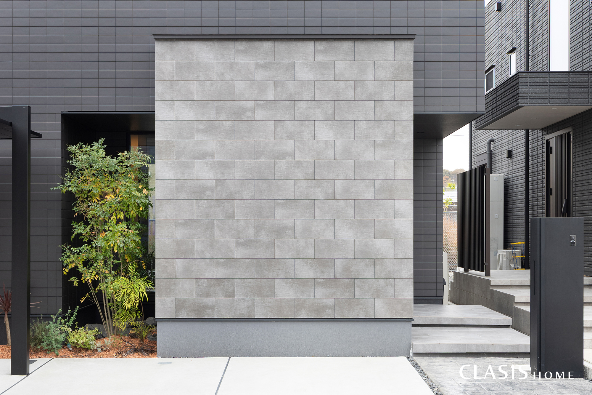 生活感を感じさせない、無機質でシンプルなBOX型の外観。正面にはあえて窓を設けず、建物の凹凸だけで奥行きと存在感を表現しています。外壁はブラックのタイルをベースに、グレーのタイルをアクセントとして採用。色味を抑えたコントラストが、より一層モダンな印象を際立たせます。