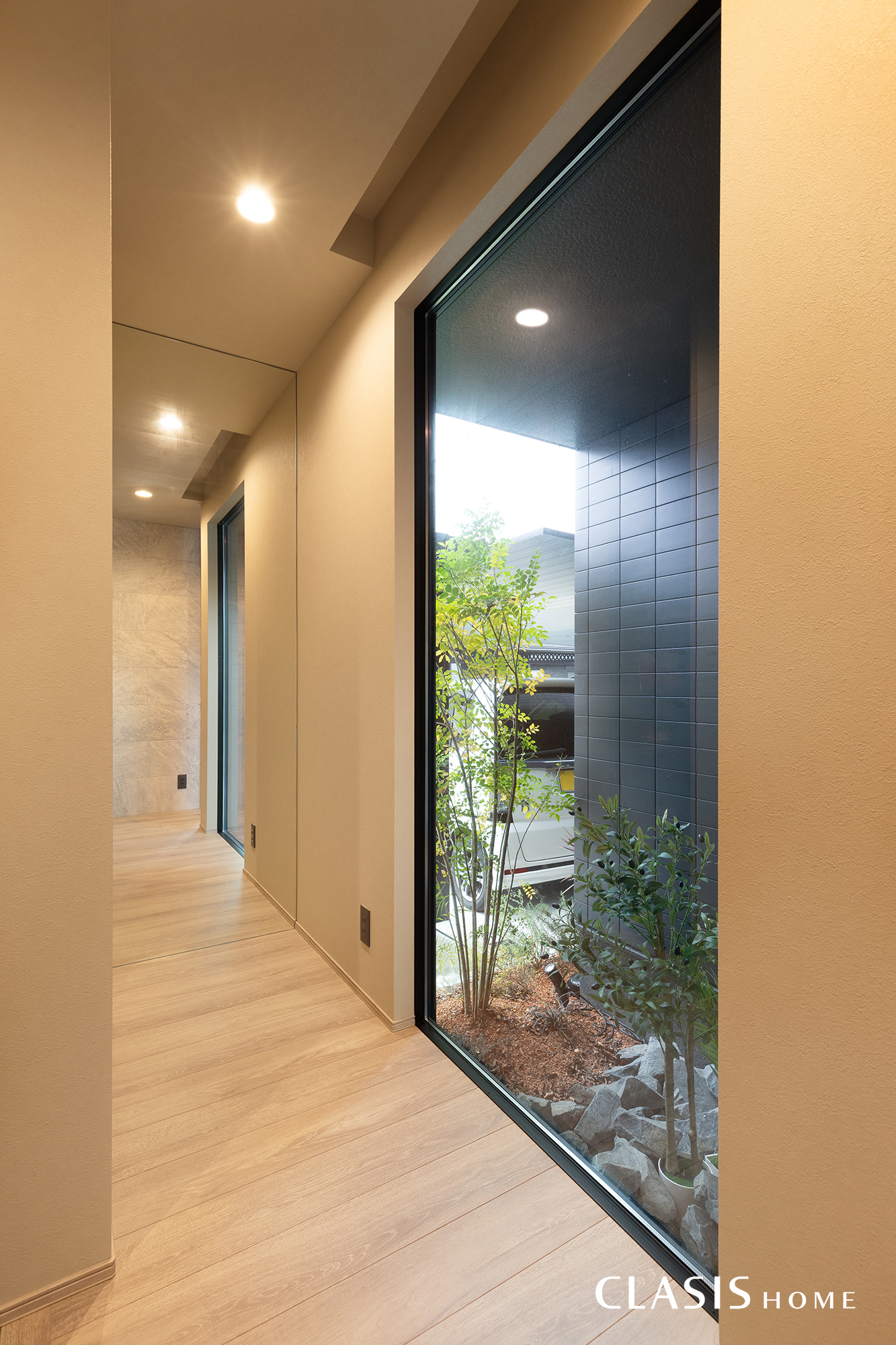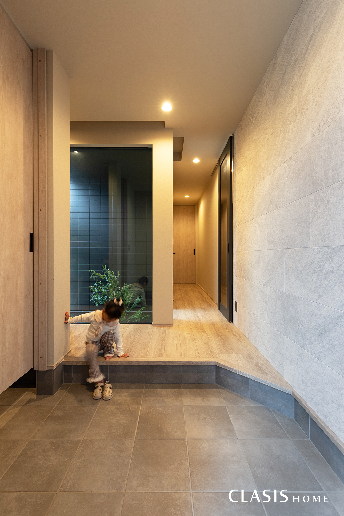 玄関正面にはFIX窓を設け、外の植栽が覗く設計に。視線が奥へと抜けることで、空間に広がりと奥行きをもたらしています。壁面には天然石のような力強い石柄が特長のエコカラットを採用。素材感のある表情が、玄関の印象を引き締めます。
