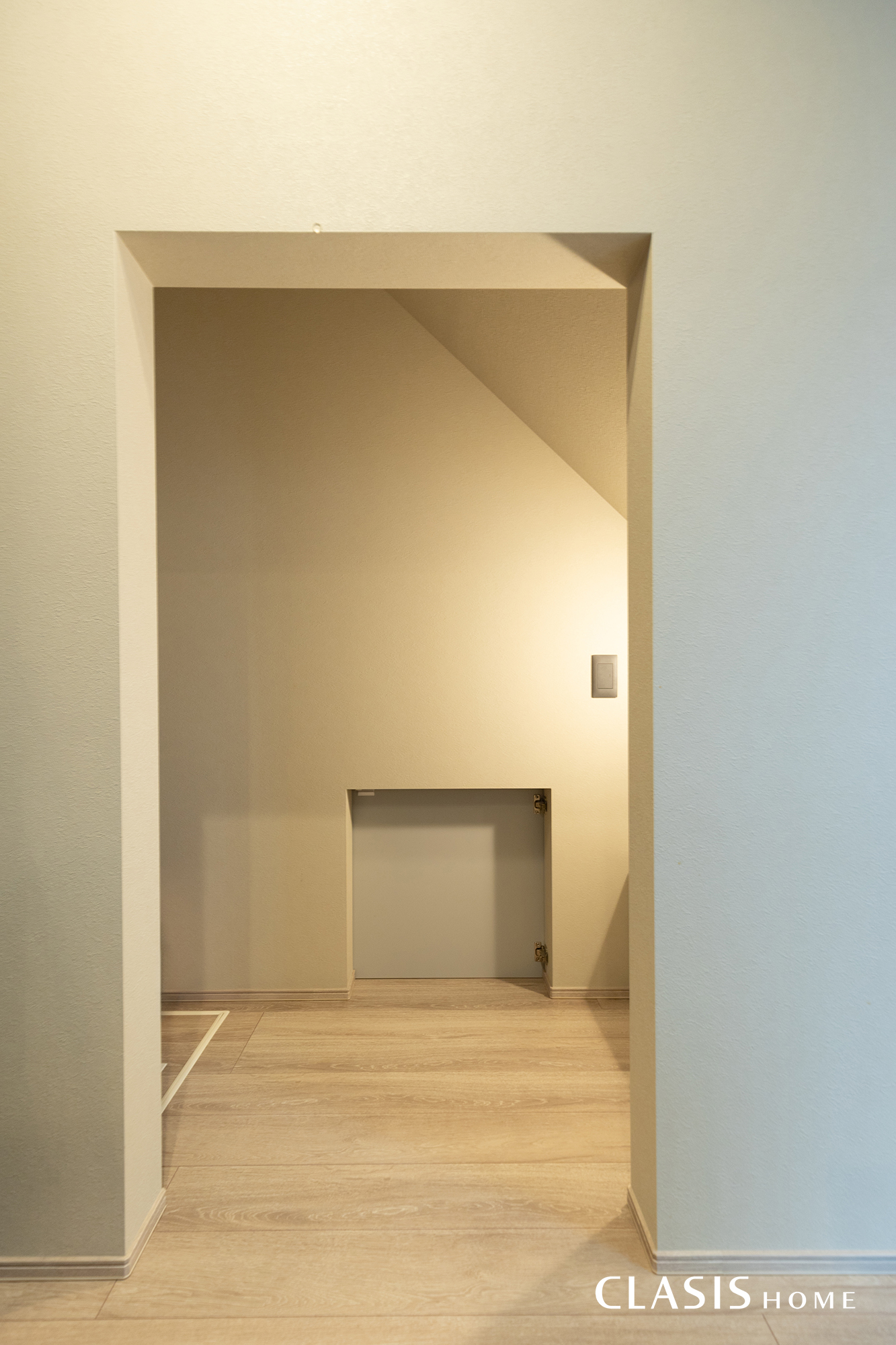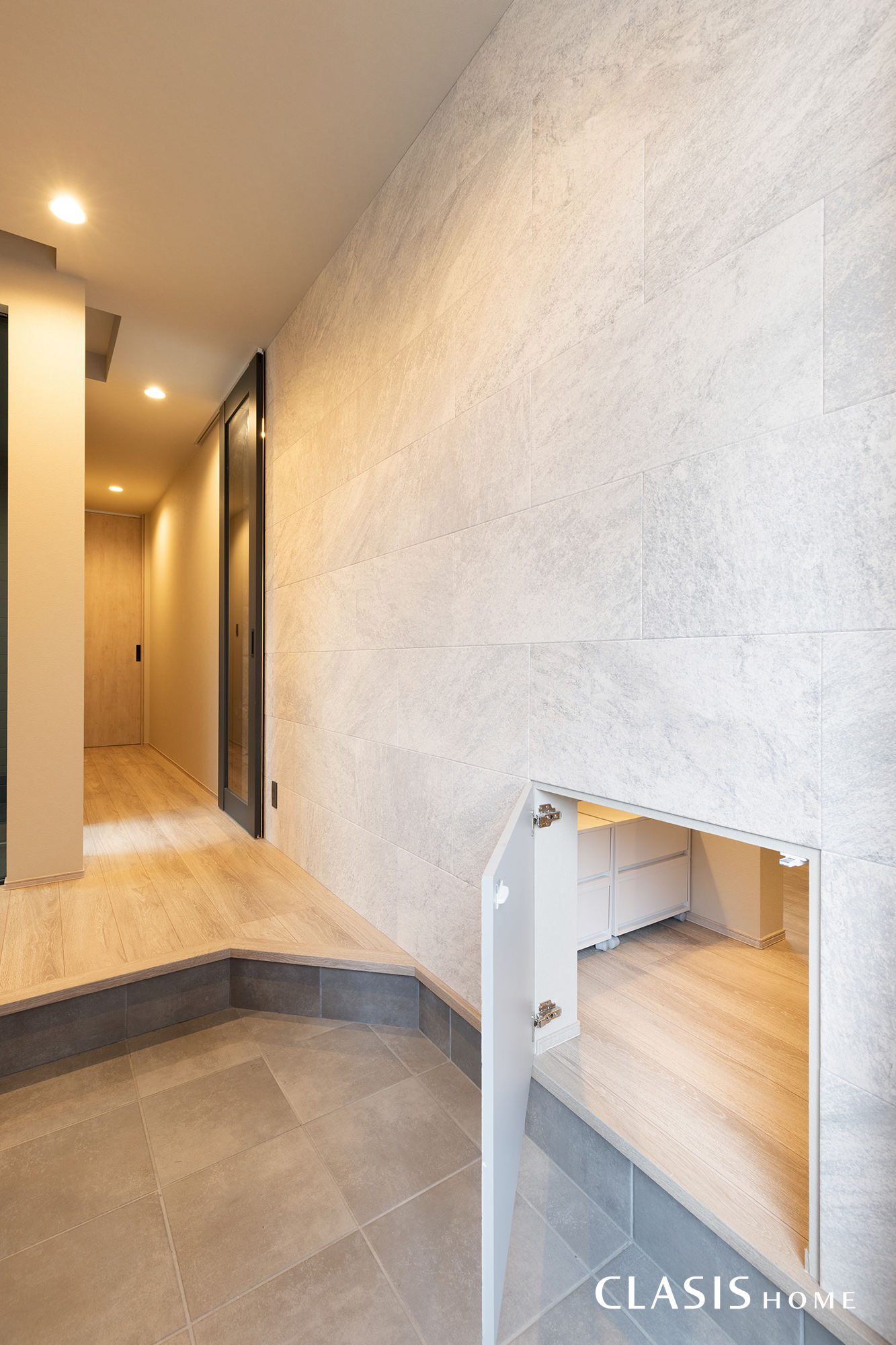 玄関の壁面には、帰宅後すぐにパントリーへ荷物を運び込める扉を設けました。扉の素材や色味を周囲のエコカラットの質感に馴染ませることで、壁の一部のように見せる工夫を施しています。買い物帰りの動きもをスムーズにする、暮らしのアイデアが詰まった設計です。