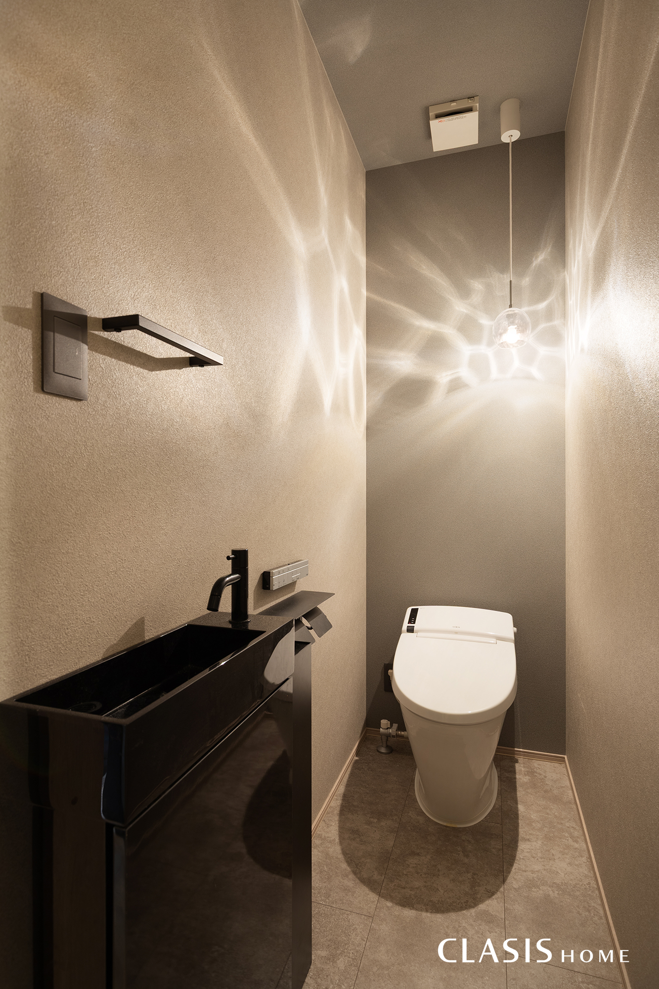 落ち着いたトーンでまとめた1階トイレは、手洗い器やタオル掛けなどのアイテムをブラックで統一。空間全体を引き締め、シックな印象に仕上げました。
