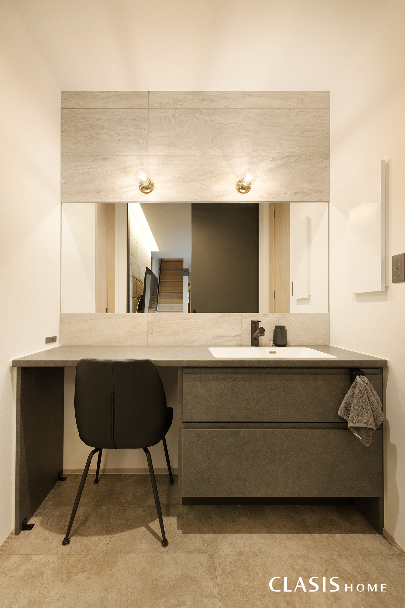 石目調のカウンターが印象的な、セミオーダーの洗面化粧台。背面にはグレートーンのタイルをあしらい、落ち着きのある表情に仕上げました。真鍮色のブラケットライトがさりげないアクセントとなり、上質な雰囲気を演出します。