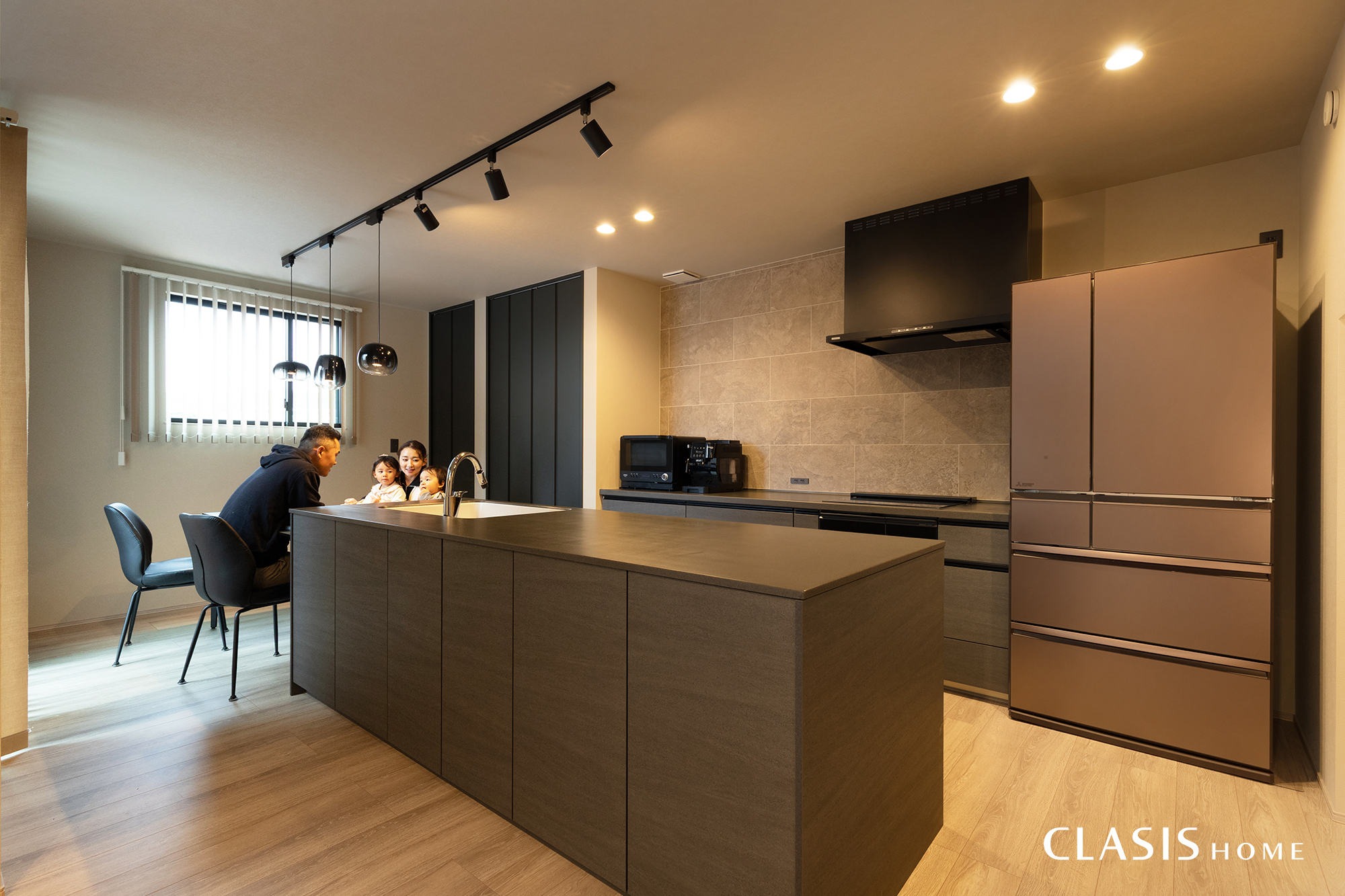Ⅱ型キッチンを採用し、ゆとりある作業スペースを確保。ダイニングテーブルを横並びに配置することで、配膳や片付けがスムーズに行える動線としています。