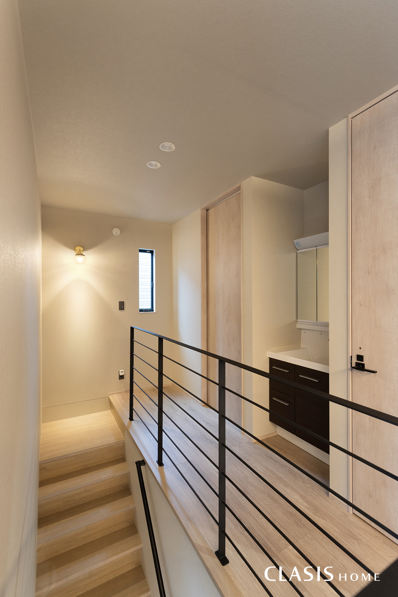 階段下のデッドスペースを有効活用し、キッチンからもアクセスしやすい位置にパントリーを設けました。2階ホールは鉄骨手摺を採用し、視線が抜ける軽やかな印象に。ホールの一角に洗面台を設置し、暮らしやすさにも配慮しました。