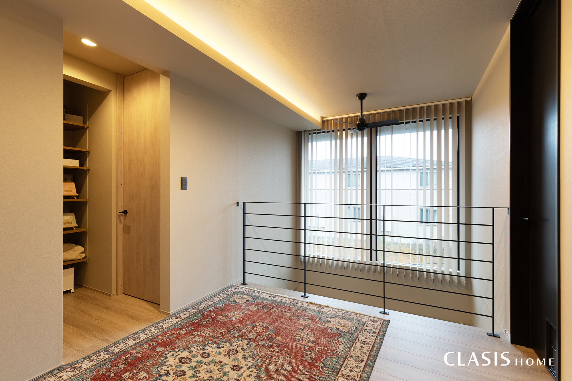 リビングの吹き抜けとつながる2階ホールは、上下階がゆるやかに連続する開放的な空間です。間接照明のやわらかな光と、吹き抜け越しの窓から生まれる広がりにより、落ち着きとゆとりを感じられるスペースとしました。セカンドリビングとしても活用できます。