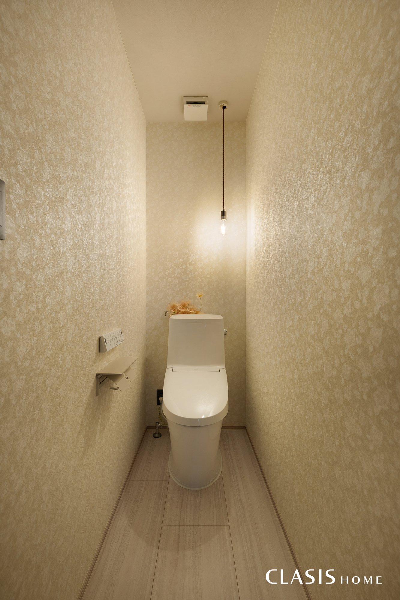 2階トイレは繊細な花柄のクロスをベースに、天井にはミルクティーカラーを組み合わせたやわらかく上品な空間。床にはグレイッシュな大理石調の素材を採用し、落ち着いた色合いの中にさりげない華やかさを添えています。