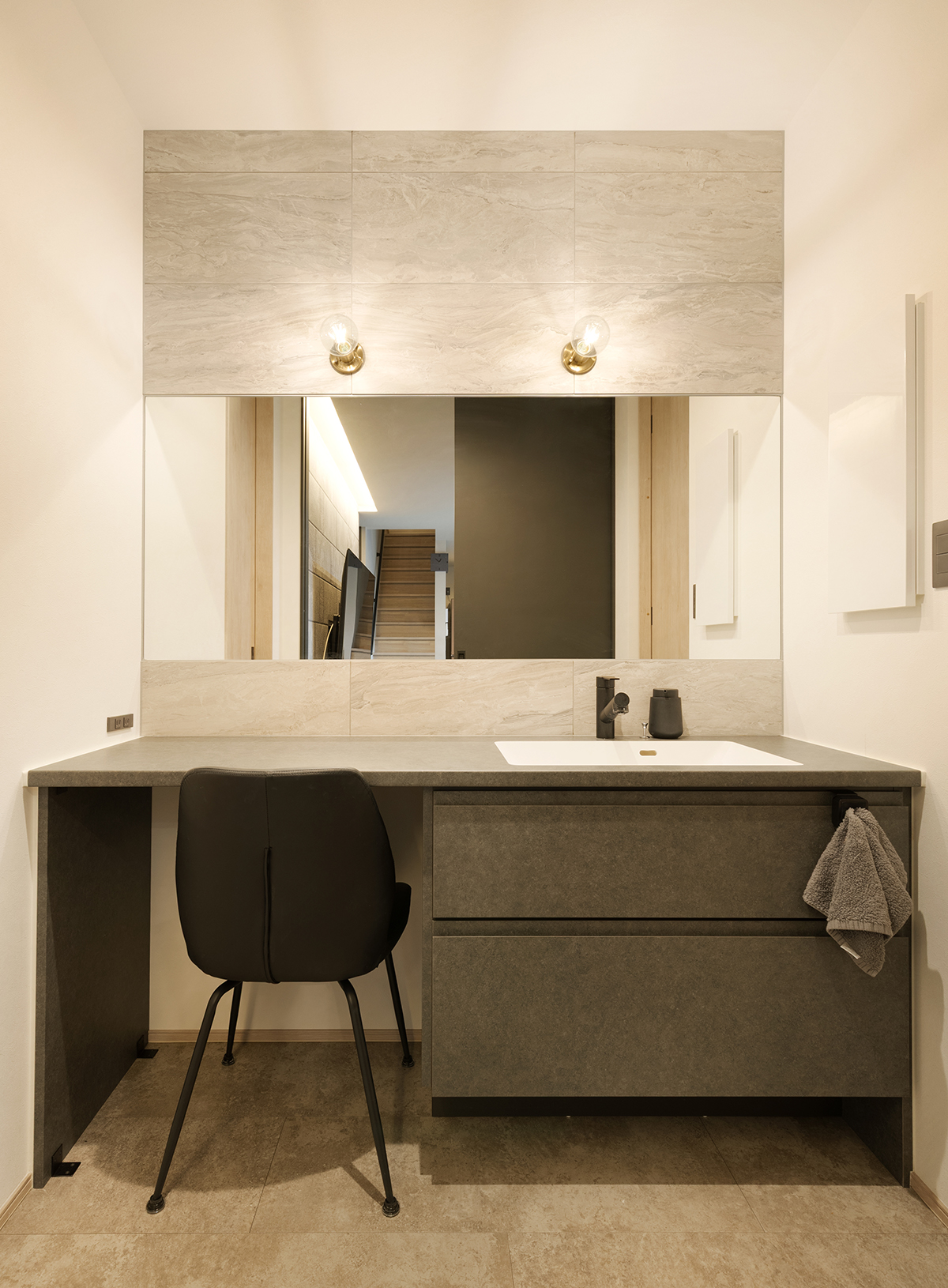 石目調のカウンターが印象的な、セミオーダーの洗面化粧台。背面にはグレートーンのタイルをあしらい、落ち着きのある表情に仕上げました。真鍮色のブラケットライトがさりげないアクセントとなり、上質な雰囲気を演出します。