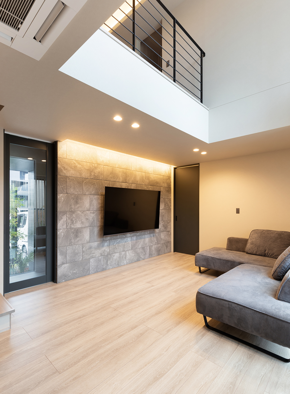 テレビ背面の壁には、石目調のエコカラットを採用。素材感のある表情が空間のアクセントとなり、間接照明がやわらかな陰影を生み出します。視線の抜けと光の演出が重なり、落ち着きのあるリビングに仕上げました。