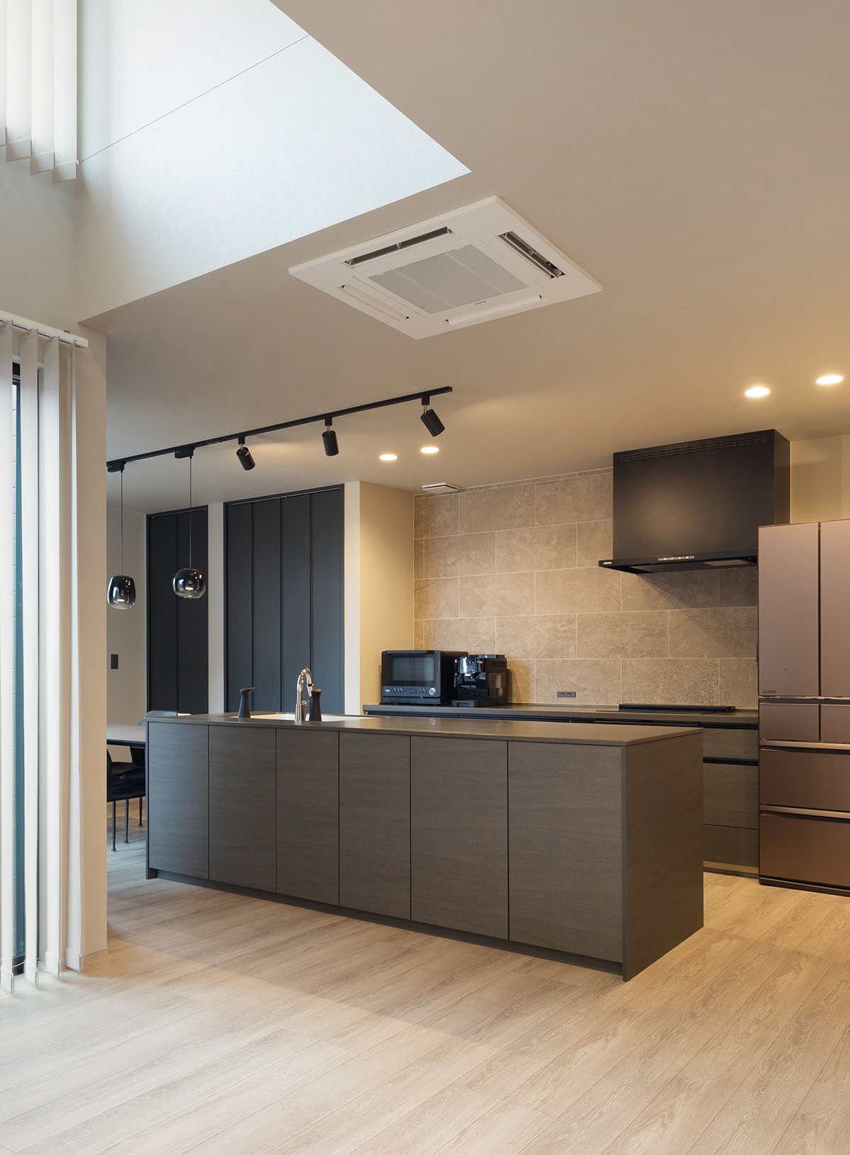 キッチン背面には、空間の色味に合わせたグレージュトーンのタイルを施工。マットな質感が空間を引き締め、落ち着きのある表情を添えています。