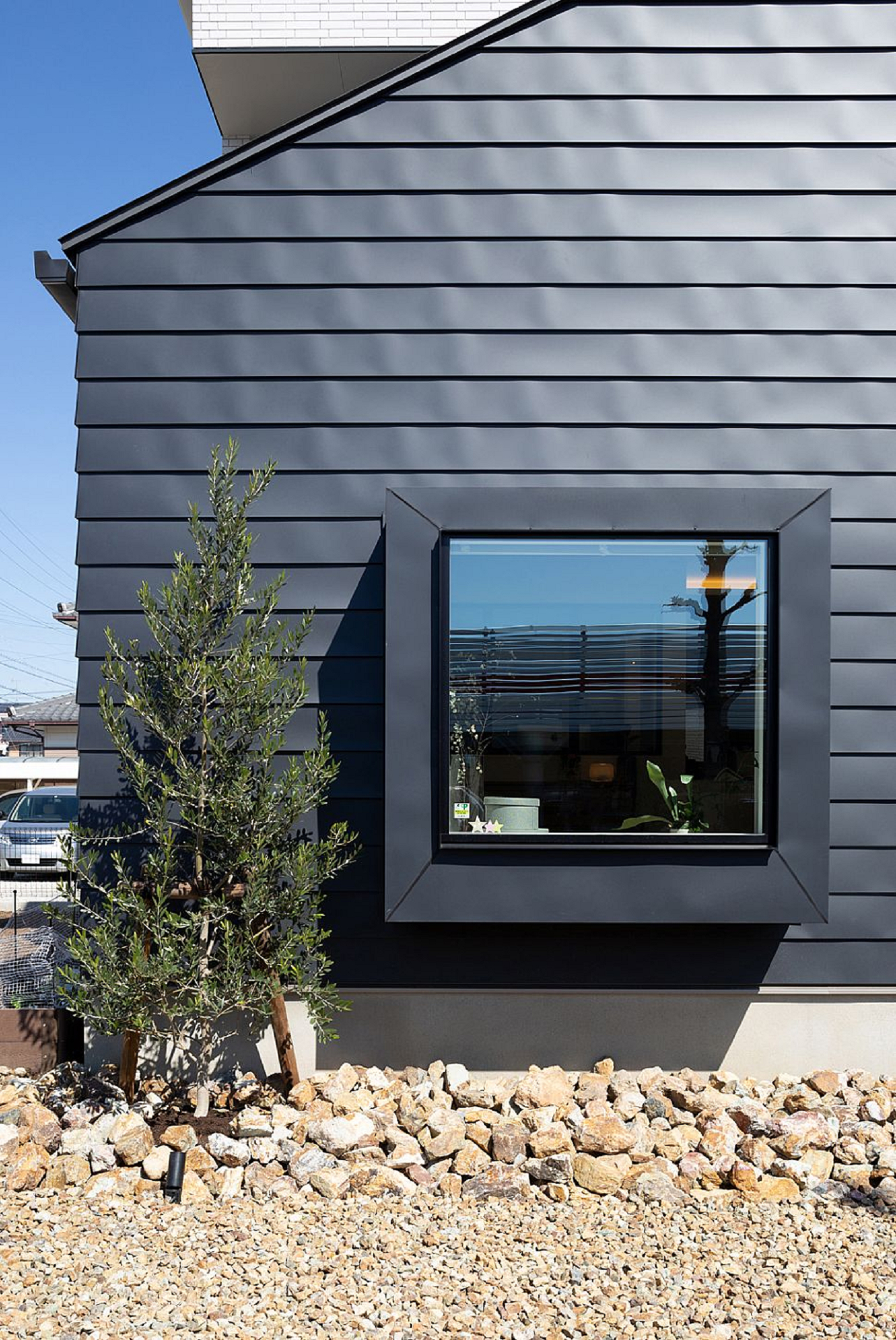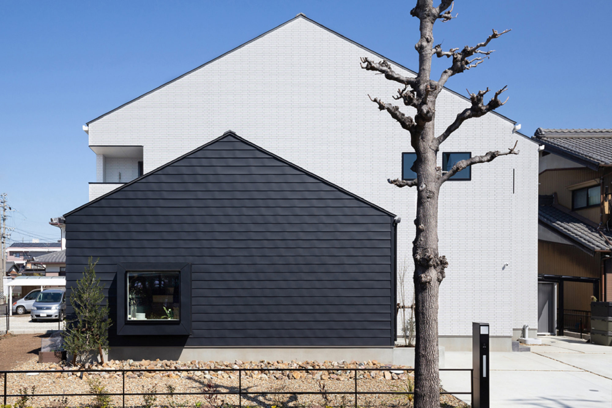 白色のタイルの切妻と、黒色のガルバリウム鋼板を使用したよろい張りの切妻が重なる家。