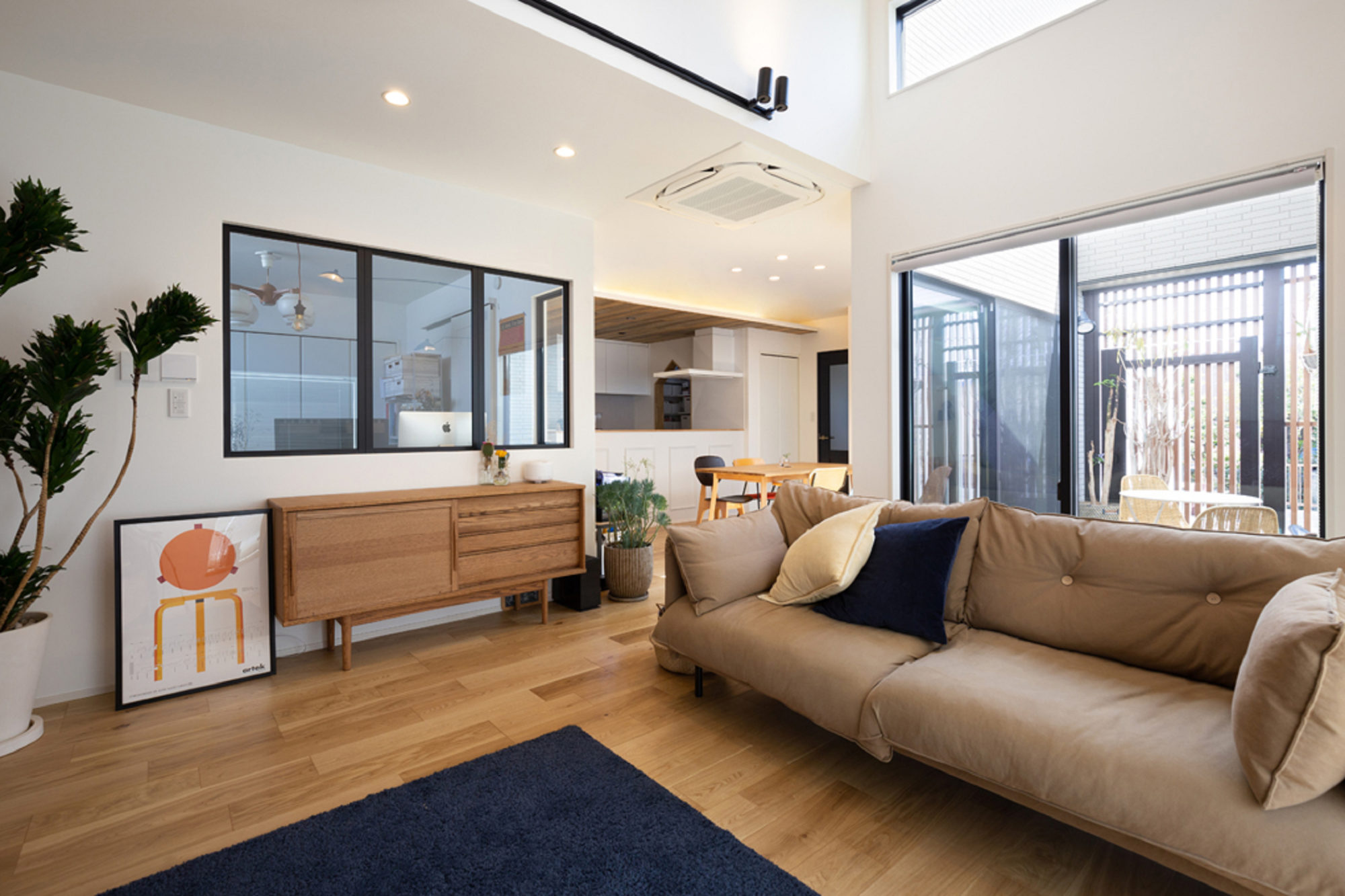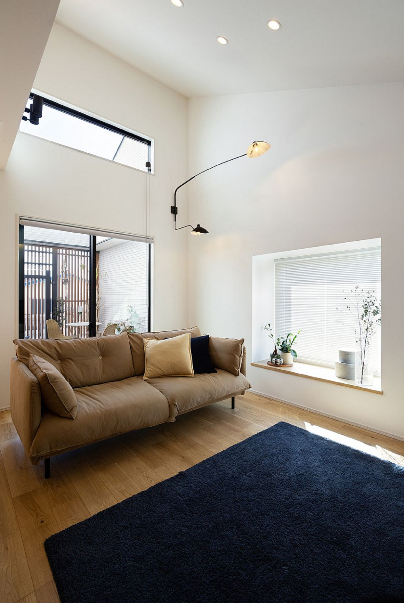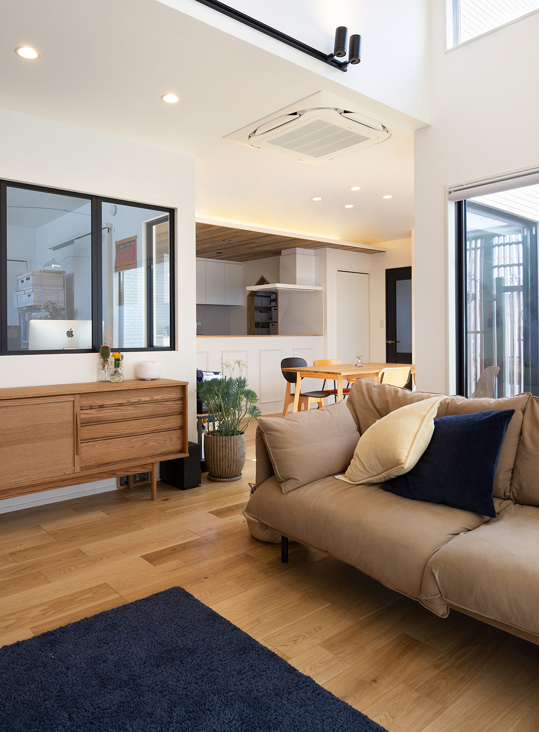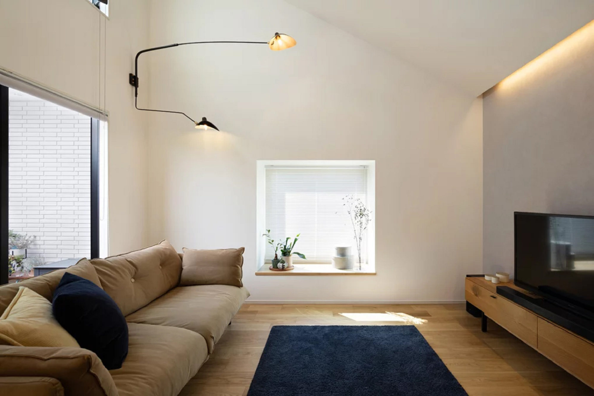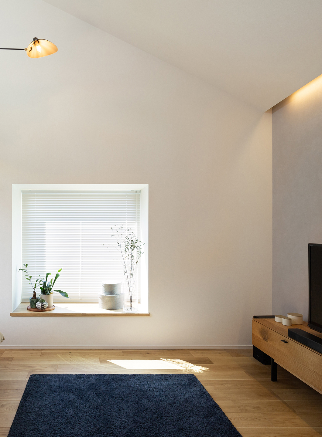 リビングの勾配天井によって明るく開放感ある空間に。窓はヌックとしてもお使いいただけるスペースです。