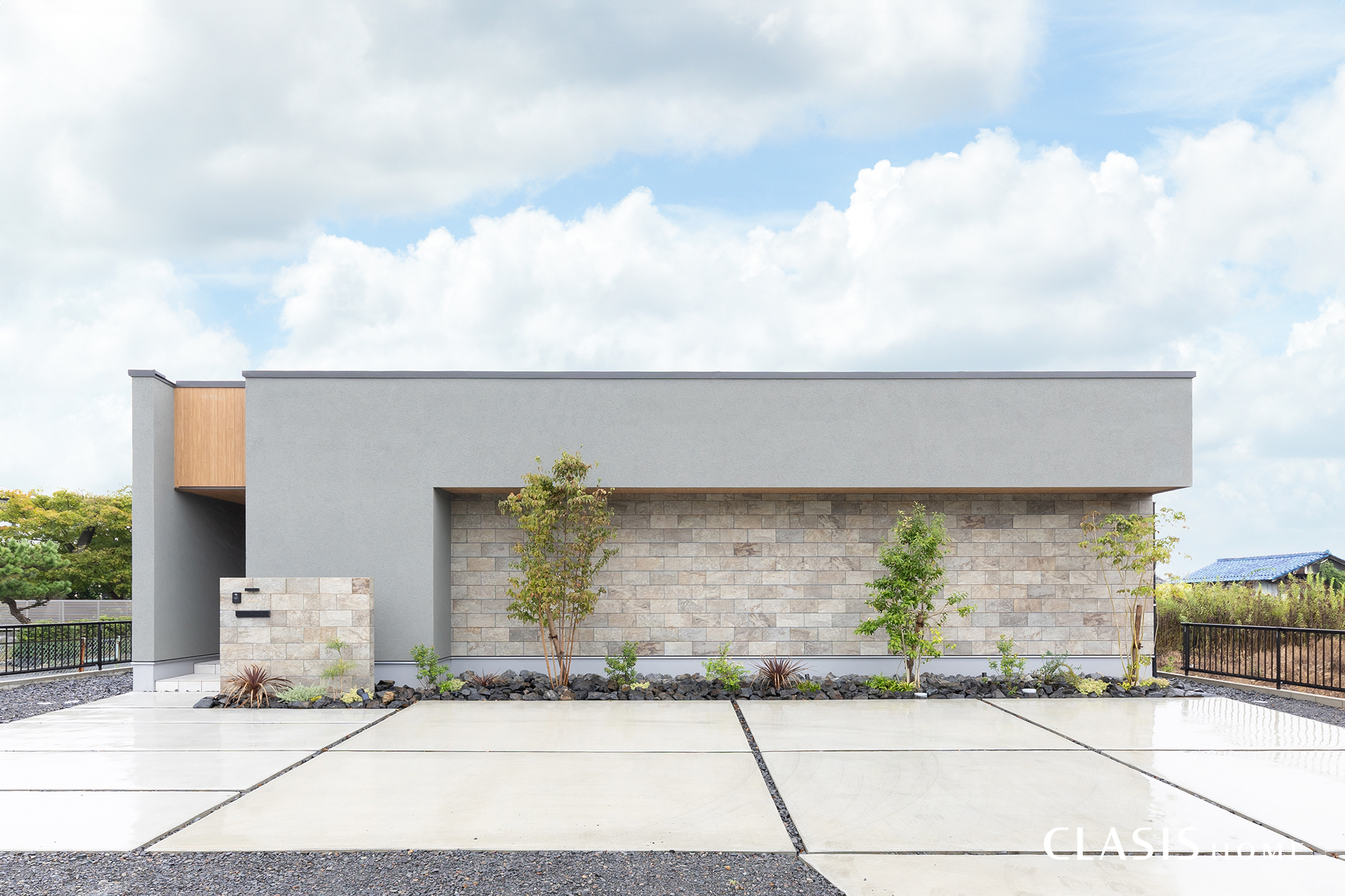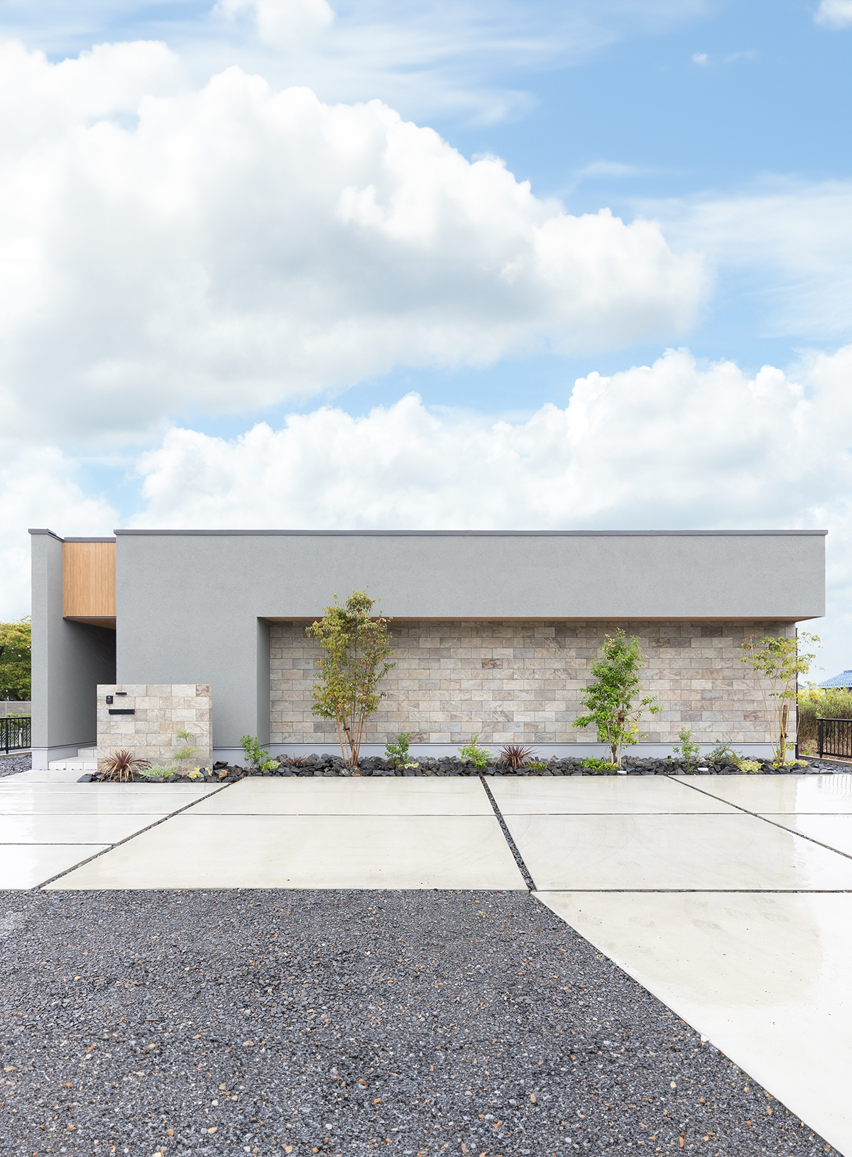 シンプルモダンでスッキリとした外観デザイン。水平ラインの美しさ、石目調タイルや木目が調和するシンプルで端正な佇まいです。