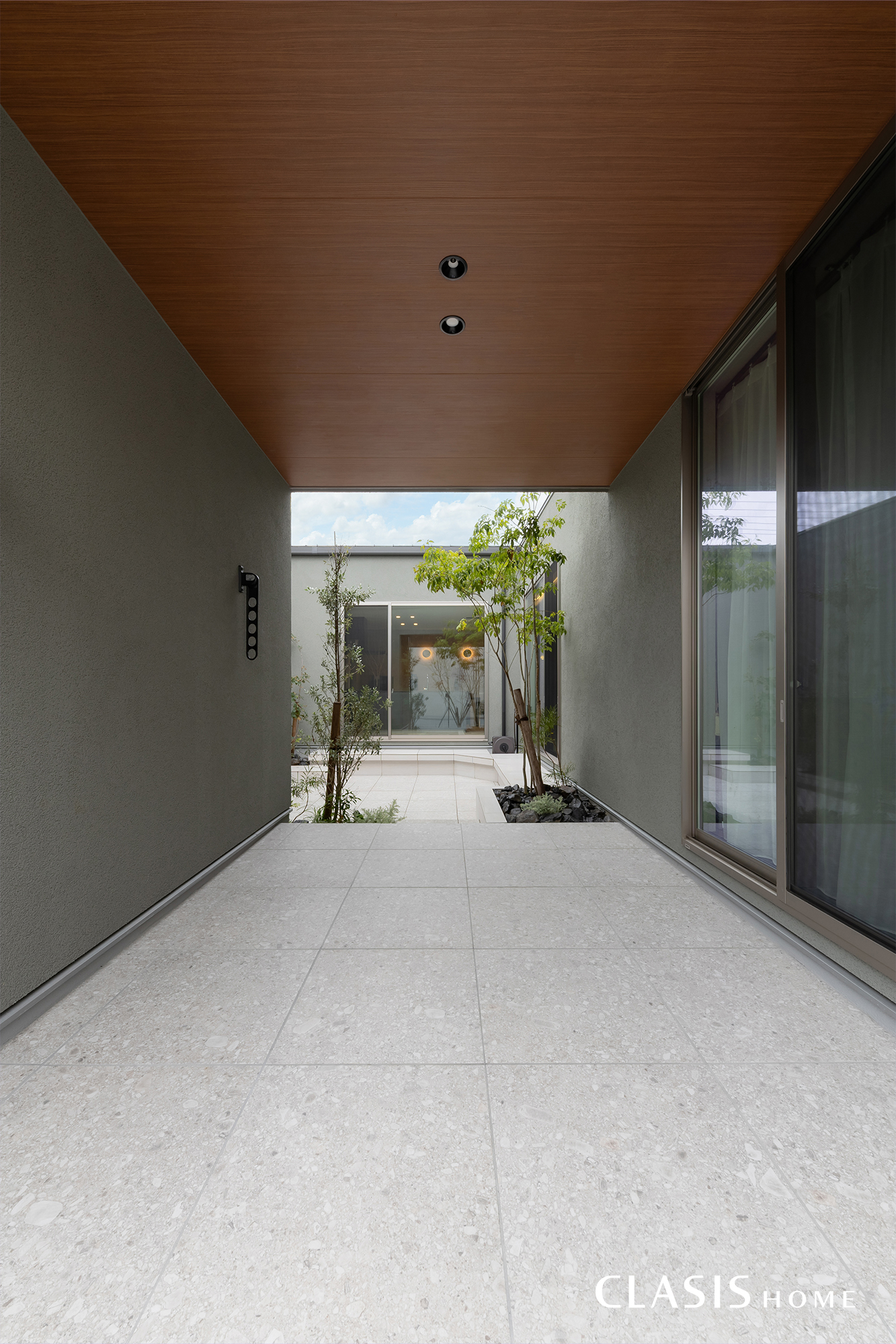 建物背面から中庭へと繋がる通路。屋根を一部設けることで、中庭のプライベート感を強めつつ、天気を気にせず洗濯物を干したりお子様の外遊具を置いたりと、軒下空間として実用的に活用できます。