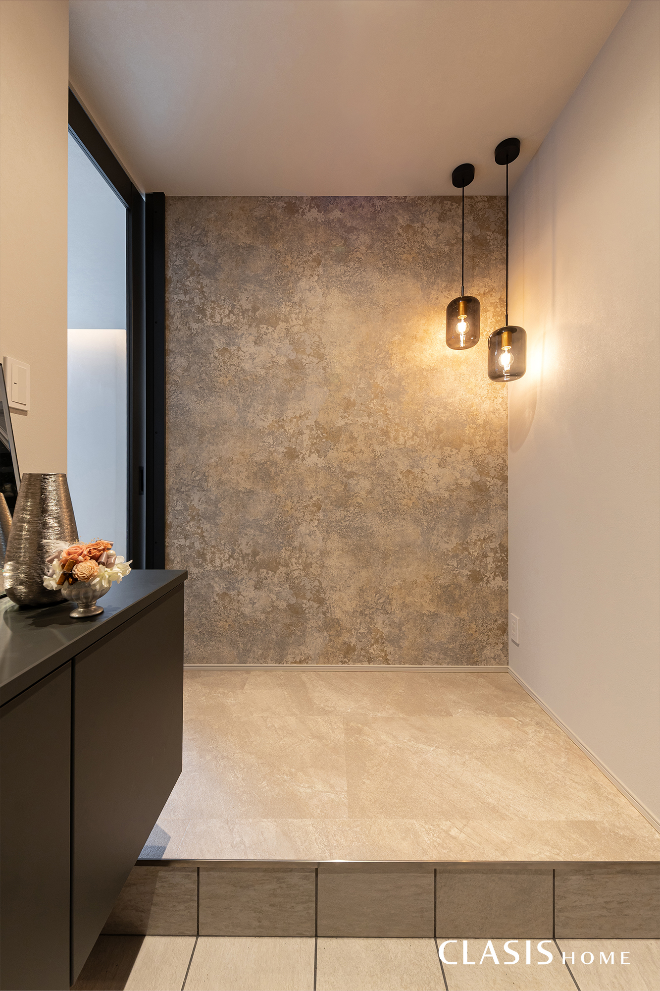 床にはフロアタイル、クロスはグレーで陰影の濃淡を楽しめるシンプルなコーディネートに。照明計画でホテルライクな印象を盛り立てました。こだわりの玄関照明が見える点もポイント。