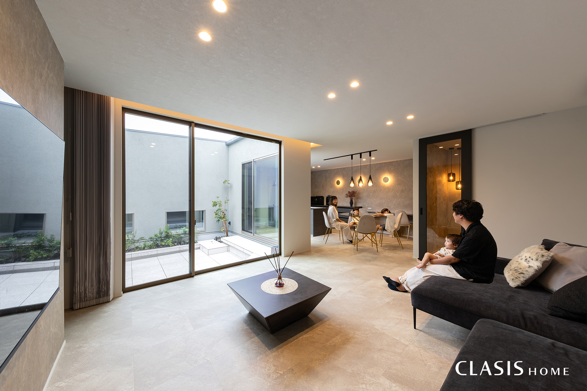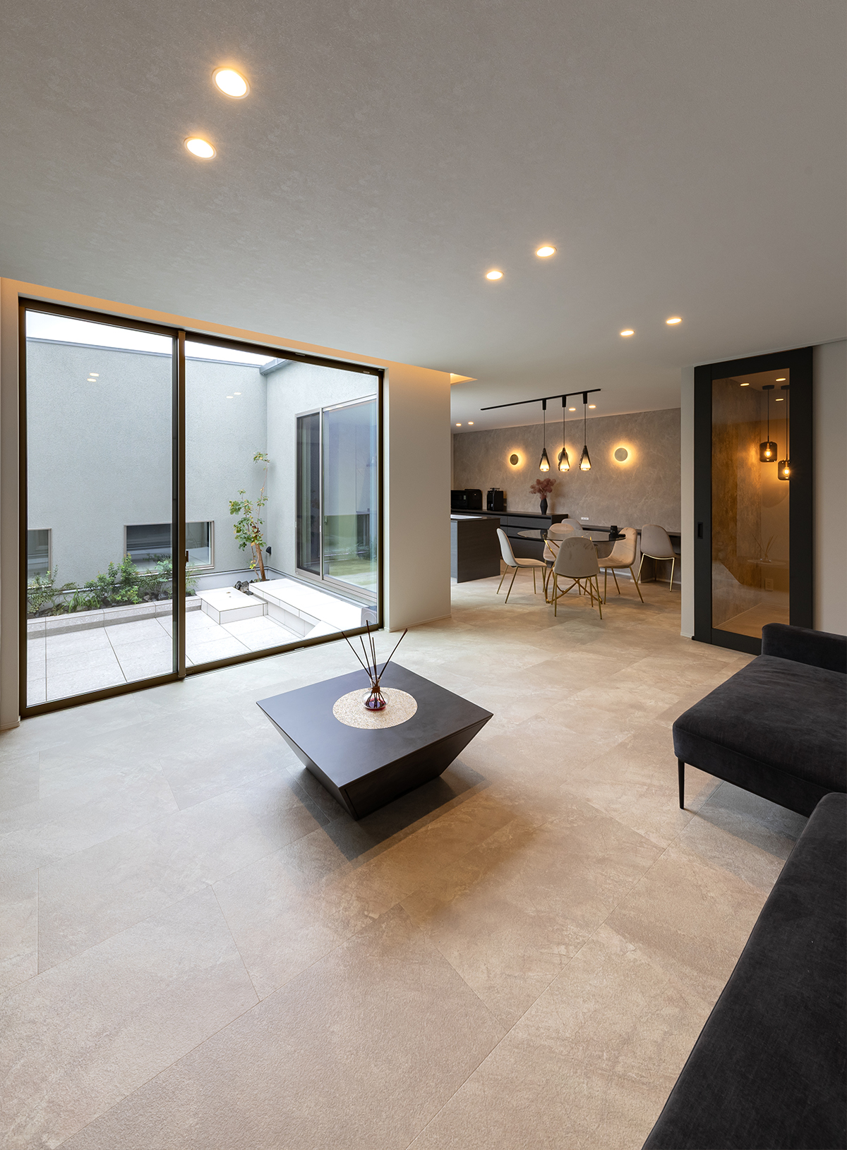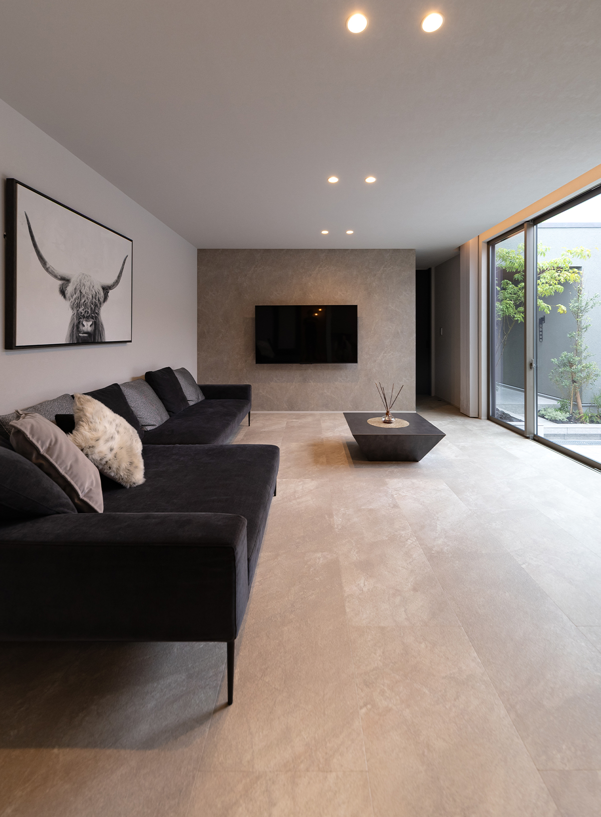 中庭との繋がりを大切にコーディネートしたリビング。網戸や窓枠で視界が遮られにくく、天井高と揃えてスッキリと見せられる窓を採用してノイズの少ない空間作りに努めています。