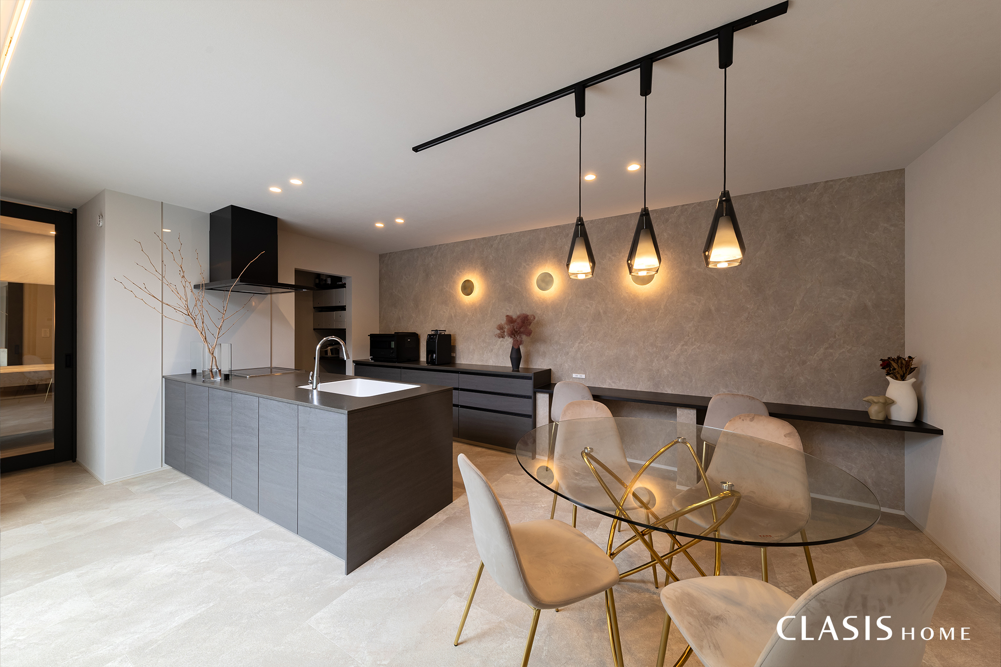 都会的でシャープな印象ながら、あたたかさも感じられるダイニングキッチン。カップボード側のアクセントクロスは、リビング側テレビ面と同じものを使用することで統一感を持たせました。洗面室に繋がる扉もガラス扉を使用して、空間を区切りつつも繋がりを感じさせる仕上がりに。