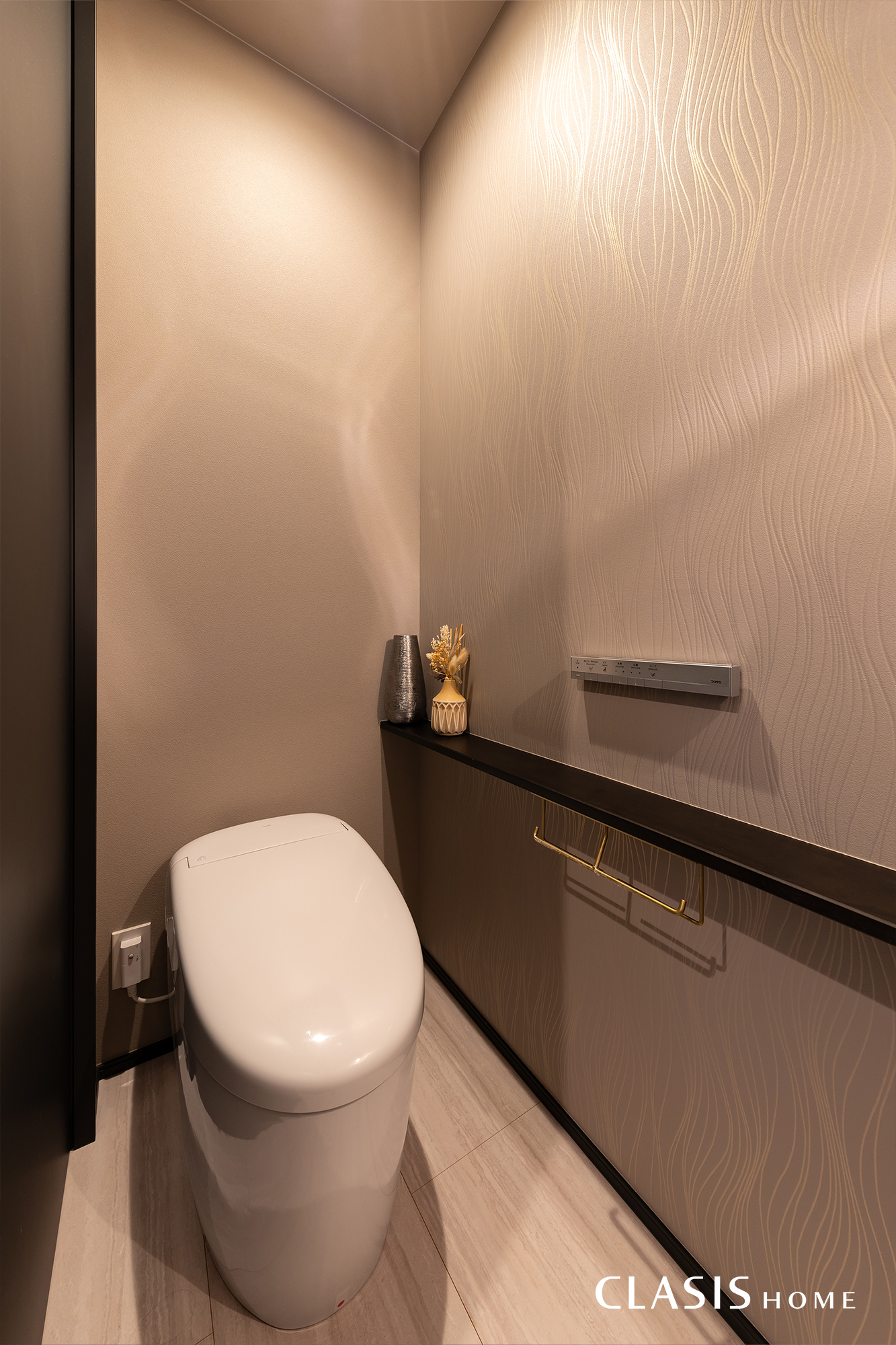 トイレは他の居室よりも落ち着きのある色合いでコーディネート。トイレの横には収納があるため、トイレ内はシンプルにカウンターだけでスッキリとまとめました。