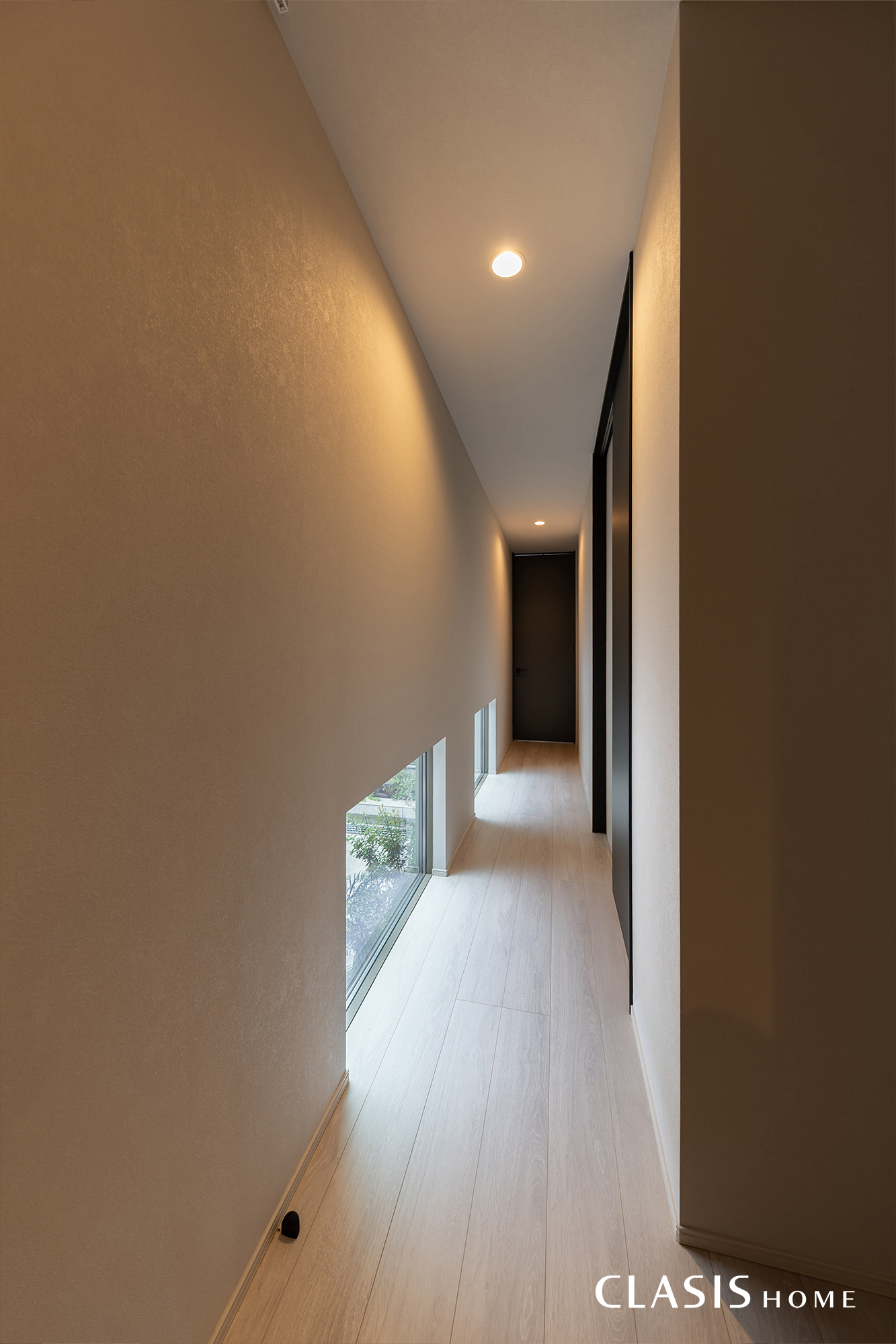 廊下は標準仕様のフローリングを使用してコストを抑えつつ、おうちの世界観に馴染む色合いのものをチョイス。地窓から光が入るため、日中は照明レスで廊下の行き来が可能です。