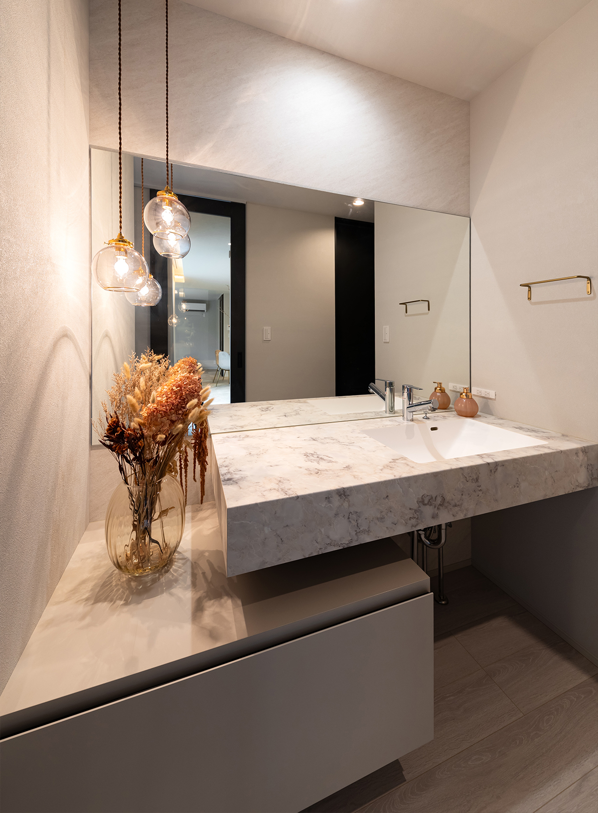 コストバランスを追求した洗面室。費用を抑えつつ、ホテルライクで非日常を感じさせるご提案をさせていただきました。大きな一面鏡は洗面台との間を空けることなく配置し、タイル等の装飾を入れずとも水ハネ対策や”広見え”を実現しました。