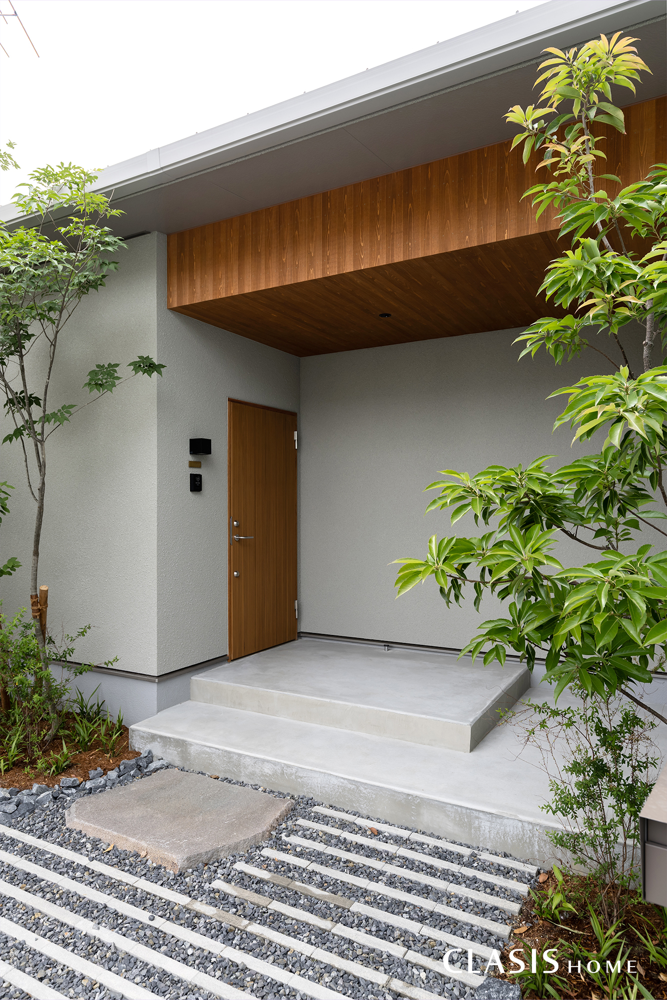 ヒノキの無垢板を玄関ポーチの天井に使用。目に入るすべての素材において、節の有無といった細かな点まで丁寧に選び抜いたことで洗練された上質な空間を演出しています。玄関扉には木目の美しさや自然な風合いが魅力の木製ドアを採用しました。