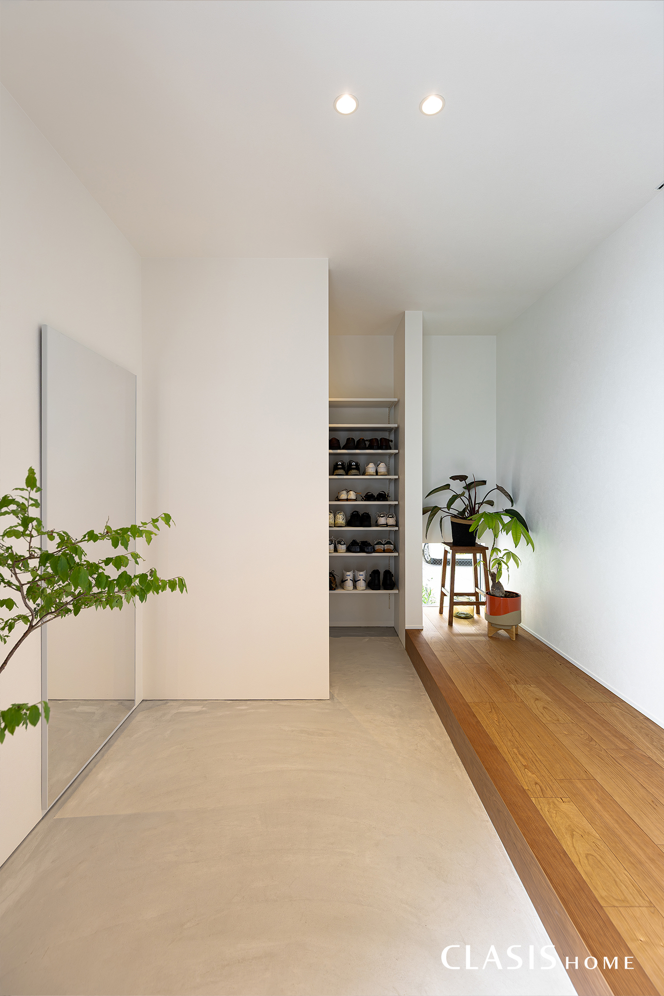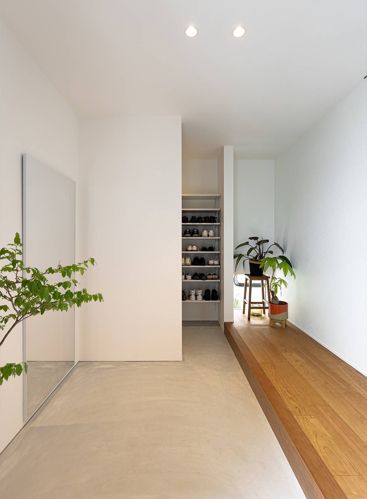 ゆったりとした玄関。LDKへ繋がる扉はガラス扉を採用し、スッキリとした印象に。ホールには地窓を設け、やわらかな光が息づく空間を目指しました。