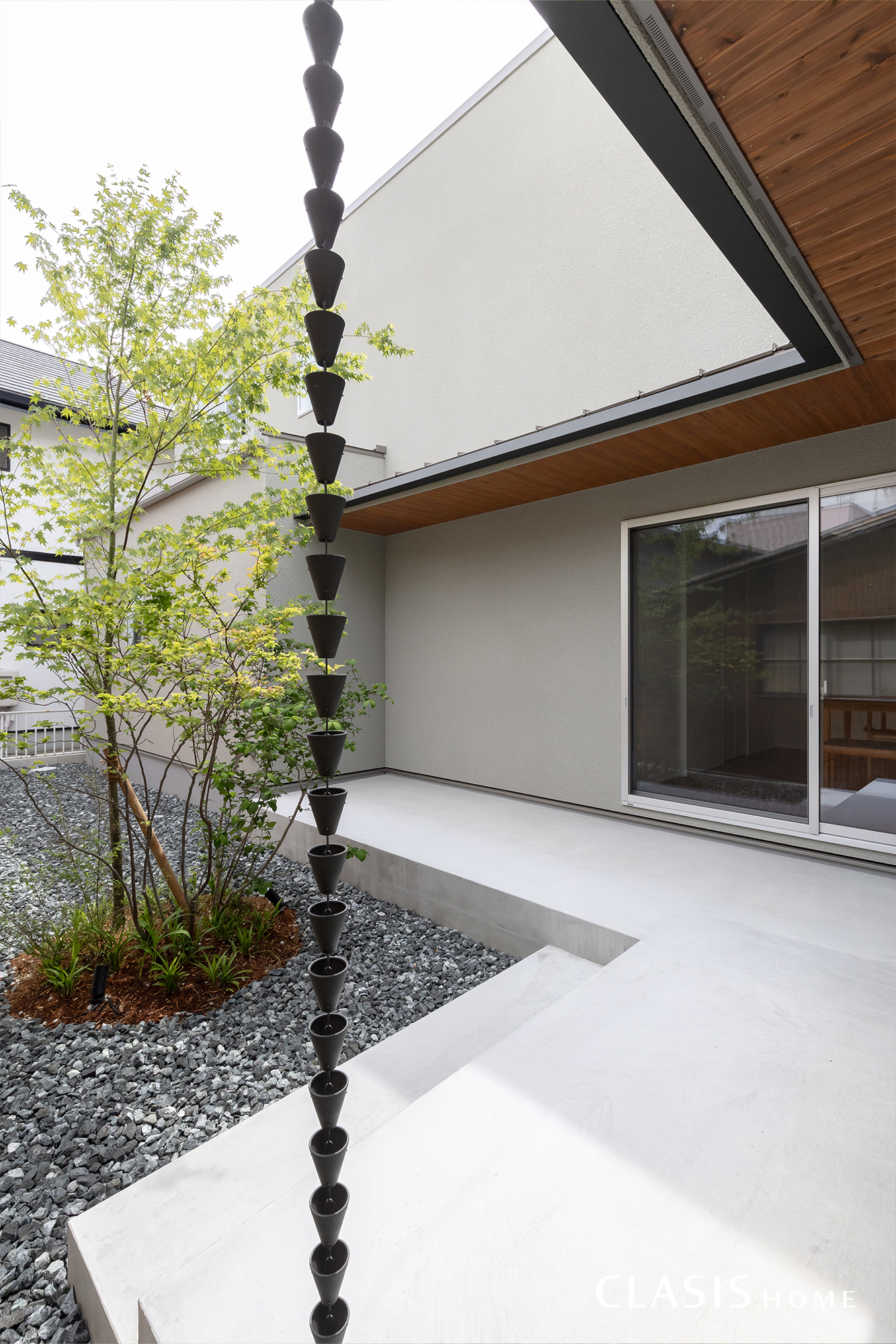 中庭の軒先には鎖樋を。雨粒を受けて静かに揺れ、雨の日が特別な景色となるようお庭に配置しました。