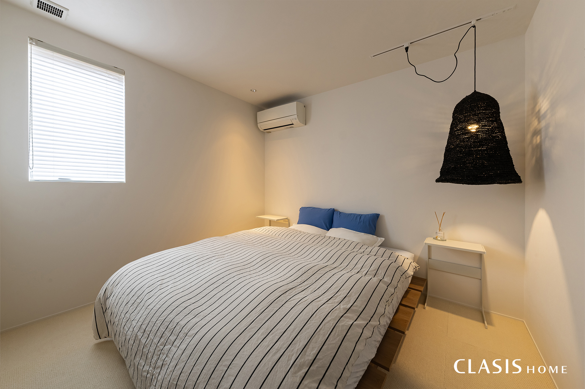 寝室はシンプル&ナチュラルでスッキリと。特徴的なヴィンテージのペンダントライトが主役の空間です。