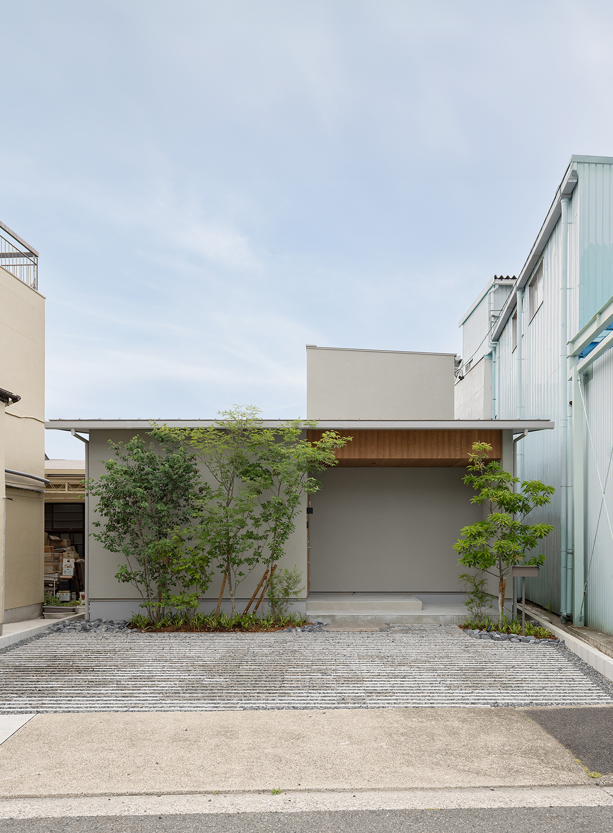 軒の水平ラインを際立たせた、塗り壁と木目が構成するシンプルで洗練されたお住まい。シンプルな素材使いだからこそ、質感や彩度などにこだわり、塗り壁と木目の納得がいく組み合わせが見つかるまで何度も検討を重ねて選んでいます。