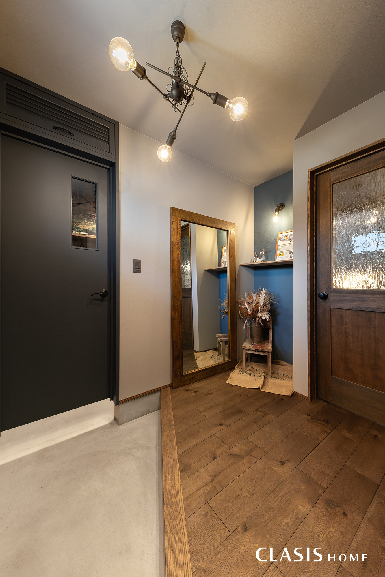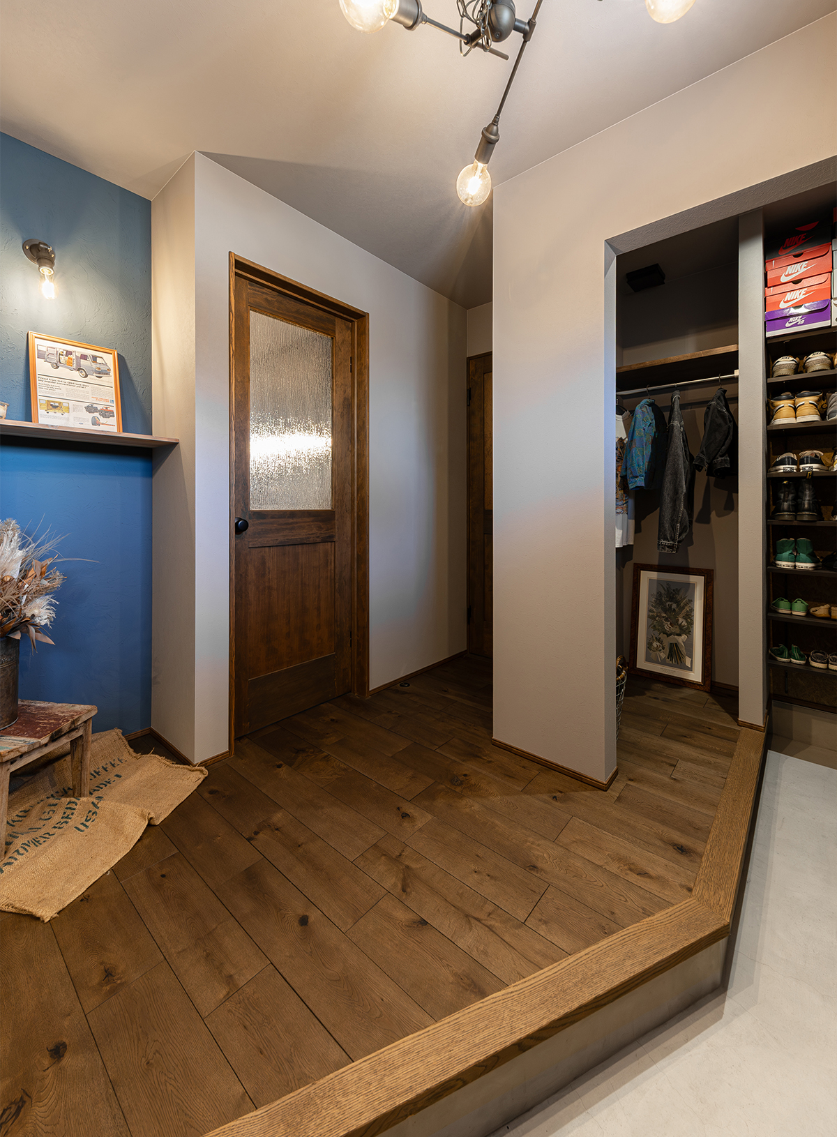 グレーのクロスをベースに、フローリングや建具には無垢材を使用し、土間はモルタル仕上げとしたラスティックな雰囲気の玄関スペース。玄関正面のブルーの塗り壁や古材を使ったカウンターなど、素材の風合いを生かした空間となっています。