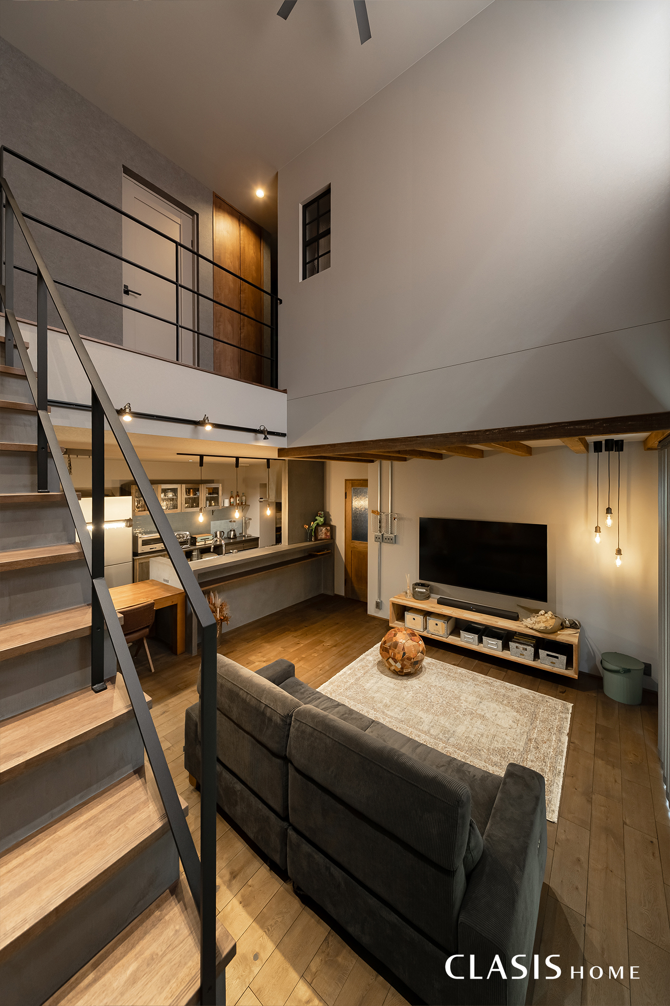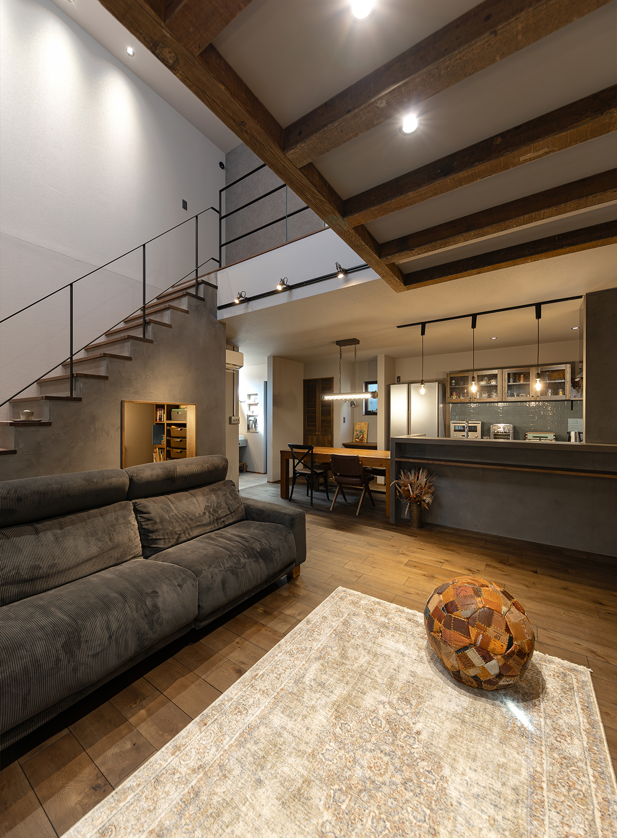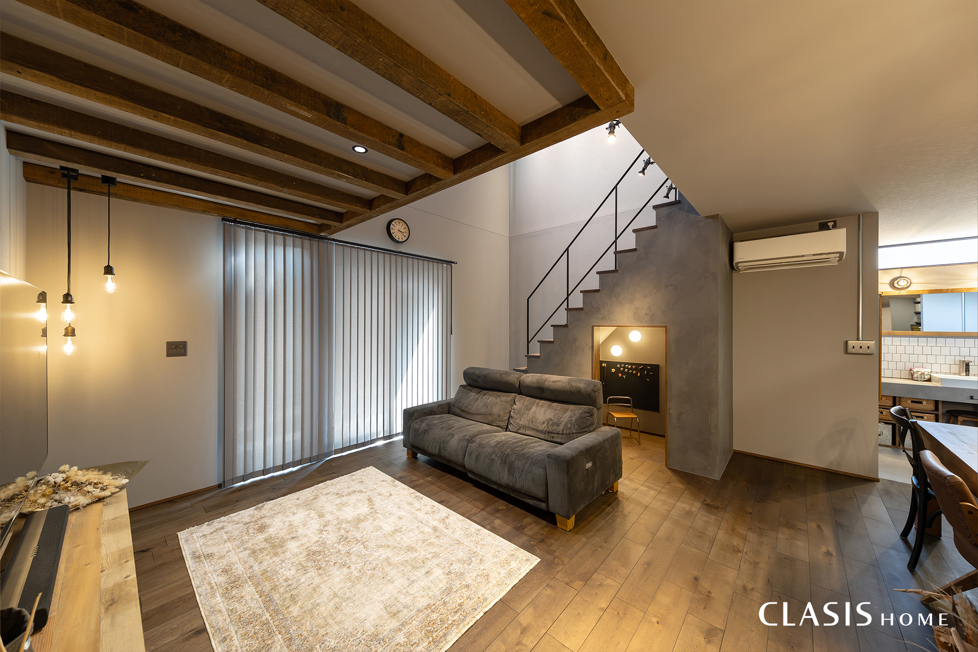 リビングの梁とTVボードには古材を使用し、ヴィンテージ感を演出。さらに、露出配管のトグルスイッチを採用することで、インダストリアルな雰囲気をプラスしています。床材にはラスティックな風合いの塗装ナラ無垢材を用い、空間全体に統一感をもたせました。