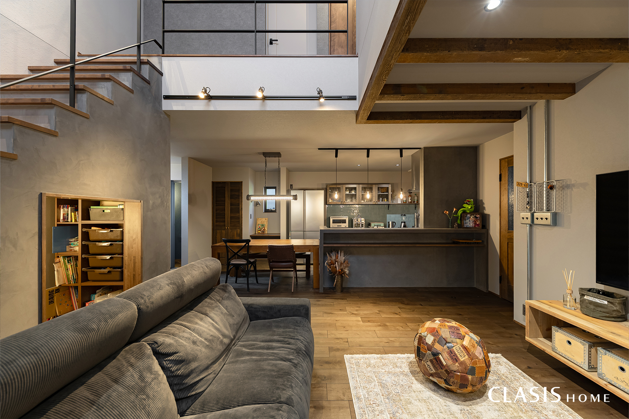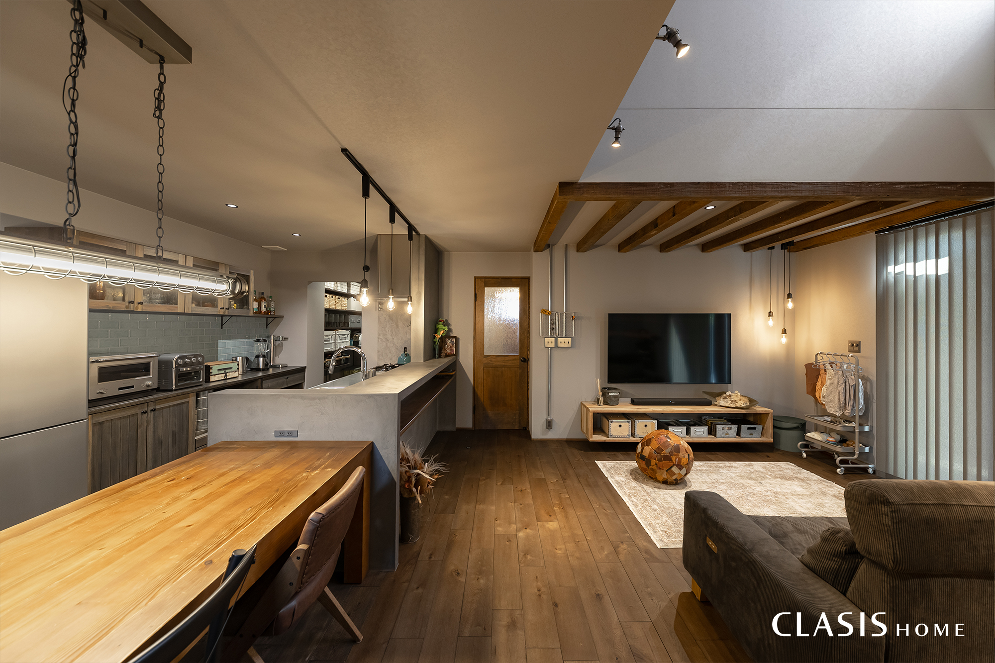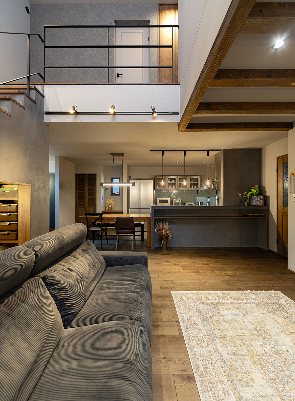 リビングの梁とTVボードには古材を使用し、ヴィンテージ感を演出。さらに、露出配管のトグルスイッチを採用することで、インダストリアルな雰囲気をプラスしています。床材にはラスティックな風合いの塗装ナラ無垢材を用い、空間全体に統一感をもたせました。