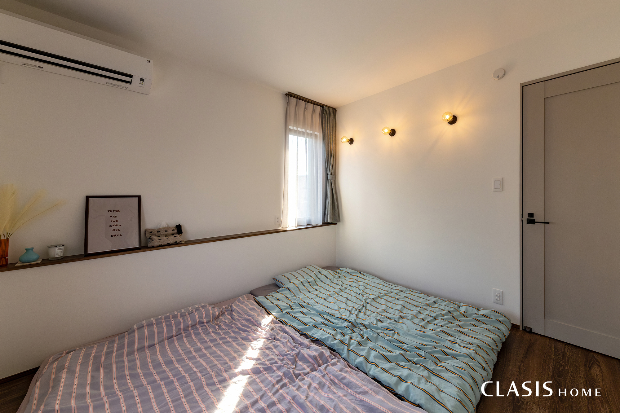 2階の寝室は白いクロスでまとめ、将来的に天井へプロジェクター映像を投影できるよう、ダウンライトやシーリングライトはあえて設けず、壁面にブラケット照明を配置。落ち着いた光の配灯により、就寝前の時間もゆったりとくつろげる空間となっています。