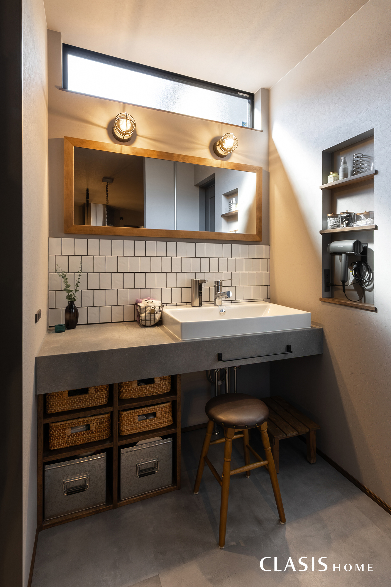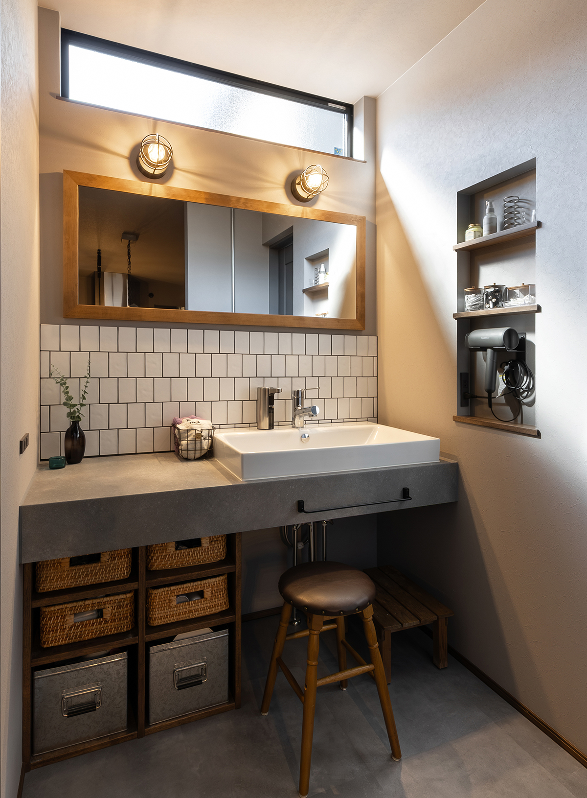 また、あらかじめ使用する収納ボックスを決めたうえで棚の高さを設定し、無駄なく収まる“シンデレラフィット”を実現。家族で並んで使える大きめの洗面ボウルや、表情のあるマット質感のタイルなど、デザイン性と使い勝手を両立した空間に仕上げています。