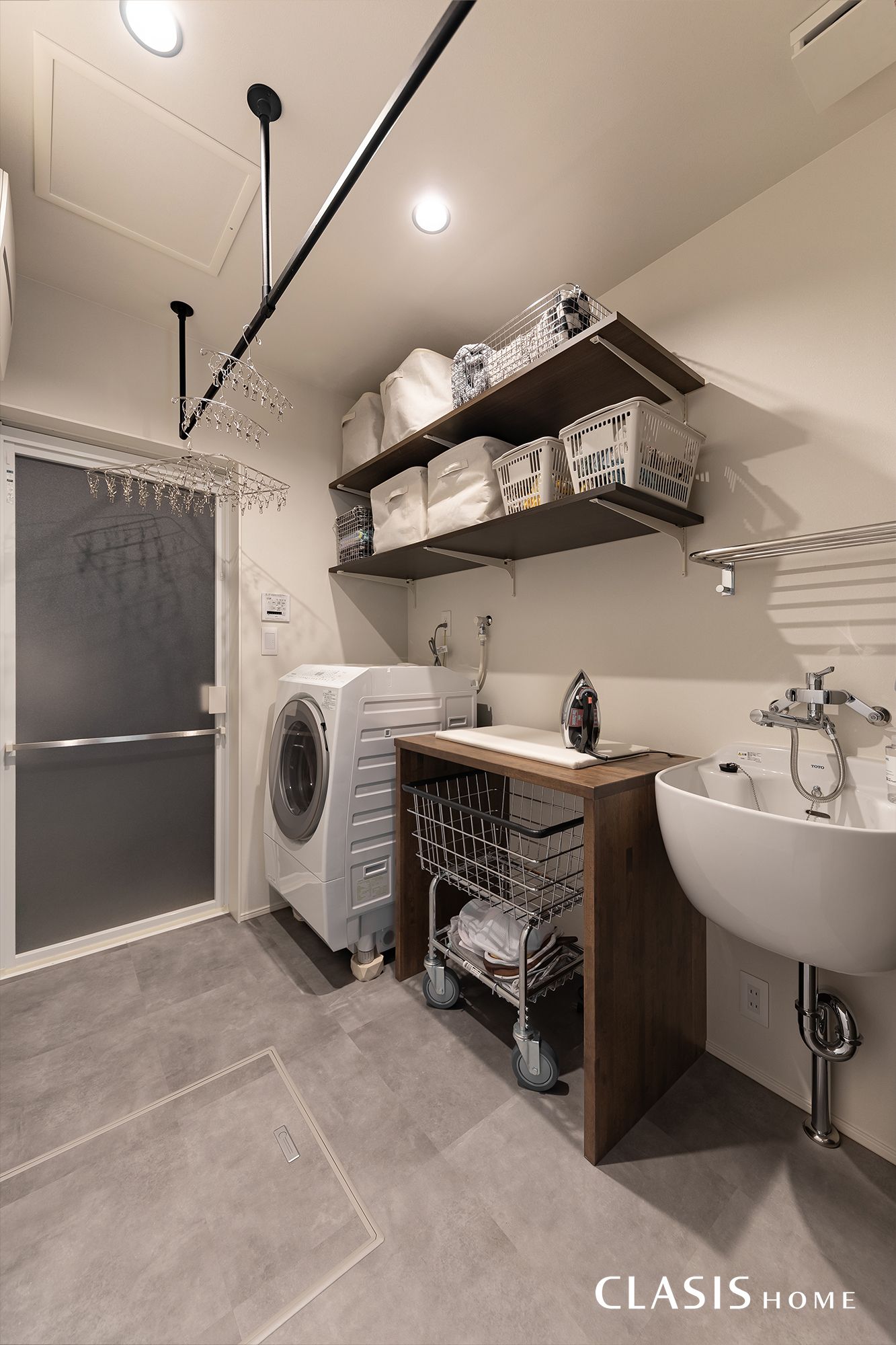 室内干しにも対応できる十分なスペースを確保し、タオルや部屋着などはランドリー内でまとめて収納できるため、洗う・干す・しまうの一連の流れがコンパクトに収まる快適な動線が実現しました。