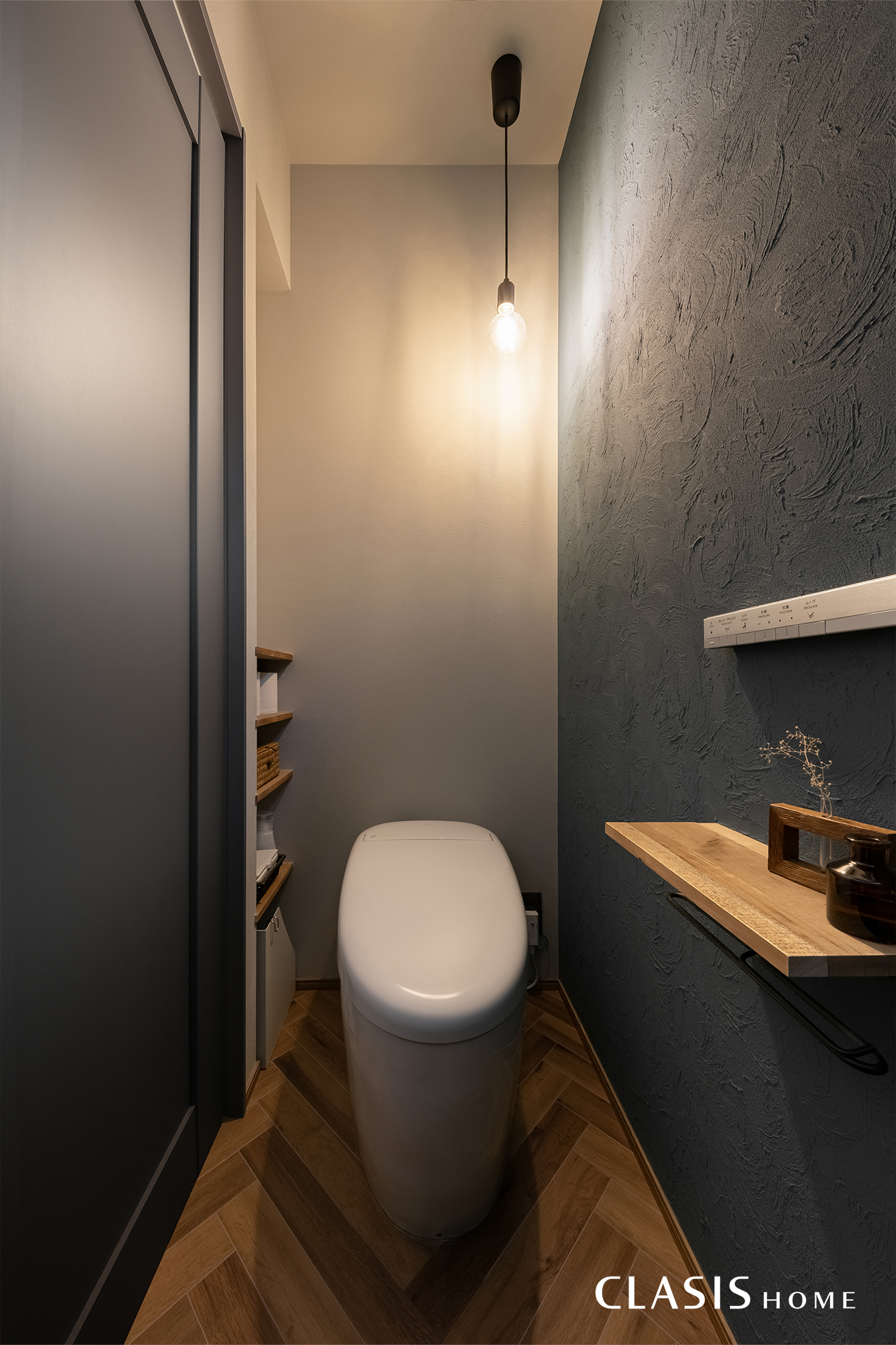 玄関ホールと同じブルーの塗り壁を使ったトイレ。床はヘリンボーン調のフロアタイルでお手入れしやすく仕上げ、収納の棚板にはTVボード造作時の余った古材を活用。限られたスペースだからこそ、塗り壁や古材の質感が際立つ、遊び心のある空間です。