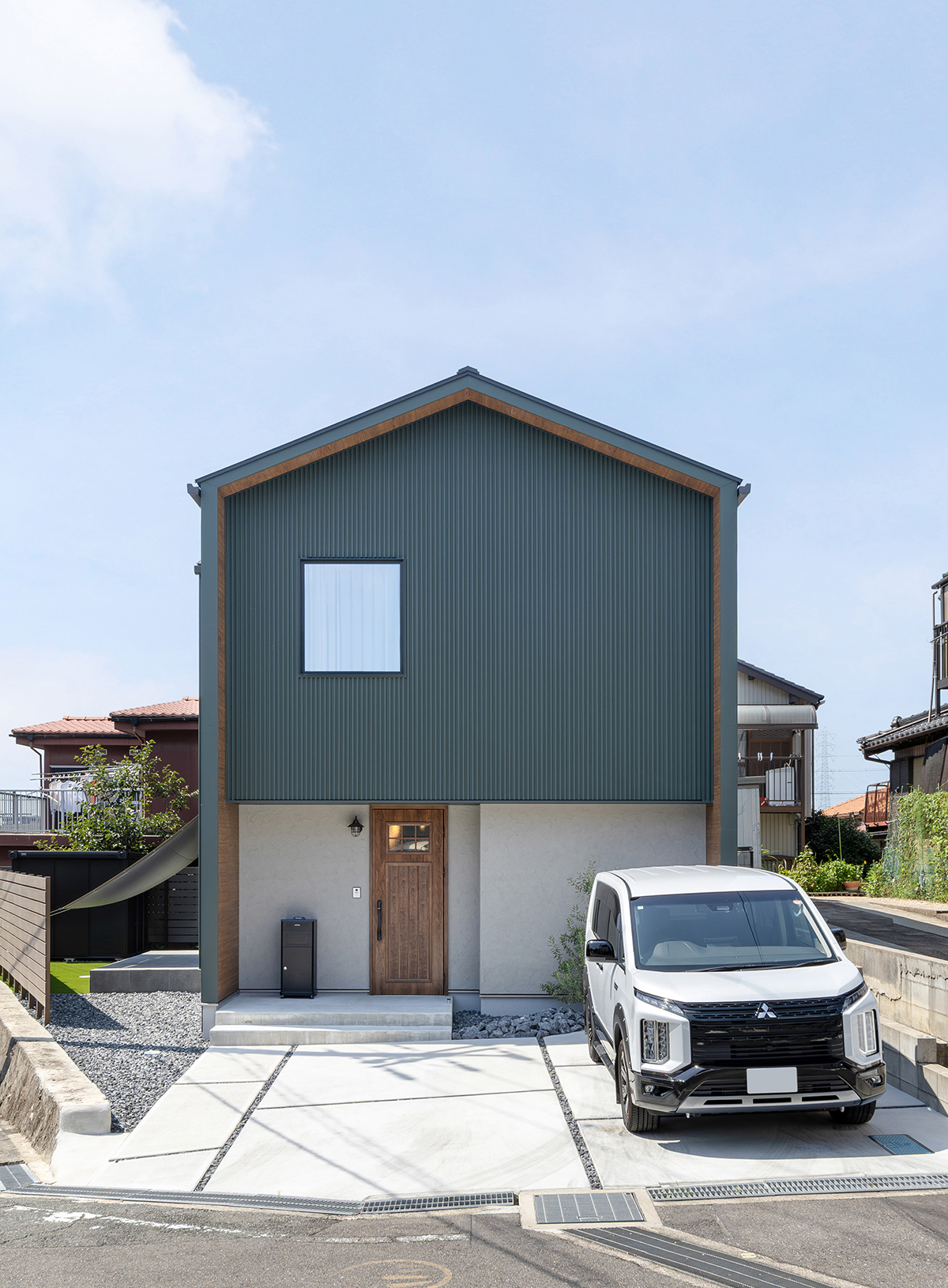 メインはガルバリウム鋼板のモスグリーンを採用し、内装のヴィンテージ感と調和させています。フレームの内側には木目を用いることで奥行きを演出。玄関まわりには塗り壁を施し、素材の質感が温かみを添えています。