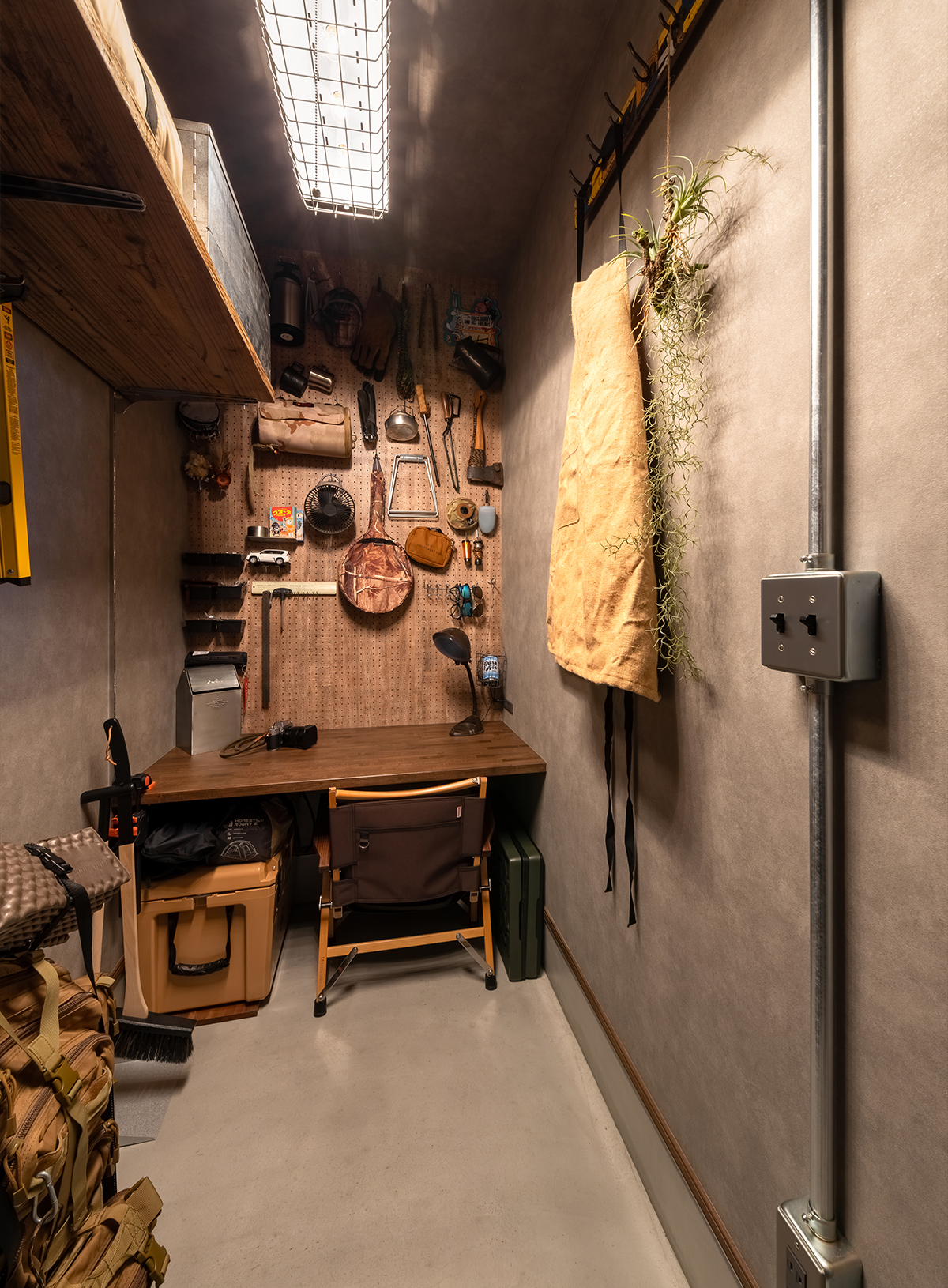 有孔ボードを活用した見せる収納や、トグルスイッチ、モルタル調のクロスを取り入れ、インダストリアルな雰囲気を演出。小物や思い出の品を飾りながら、趣味と収納を両立できる空間となっています。