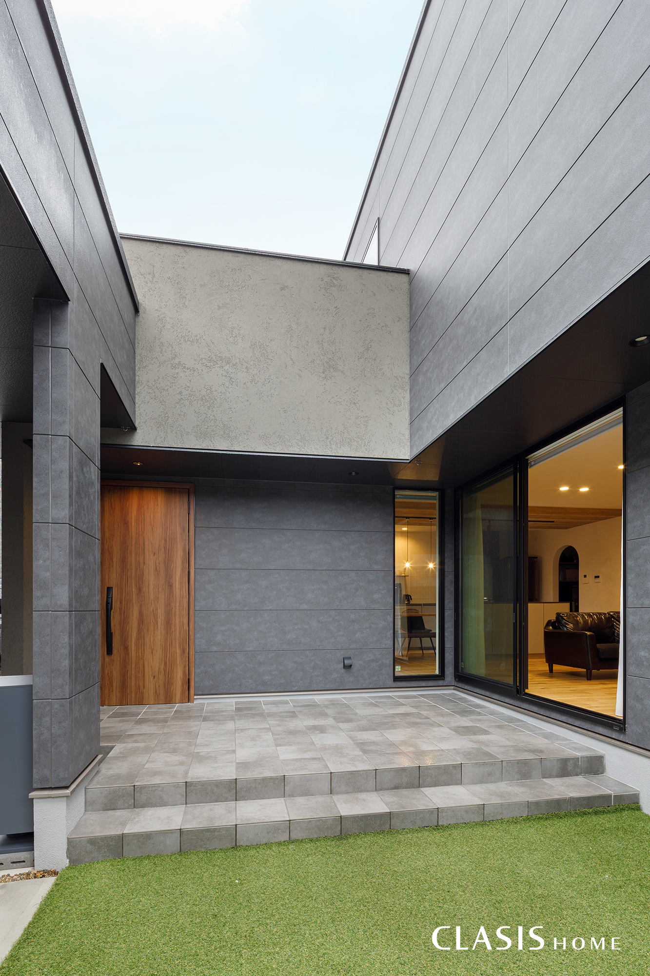 ガレージを目隠しとして活用し、プライバシーに配慮した中庭を計画。玄関ポーチとお庭のタイルデッキを連続させることで、広がりのある外部空間としました。玄関からリビングの掃き出し窓へと軒がつながり、一体感をもたせています。