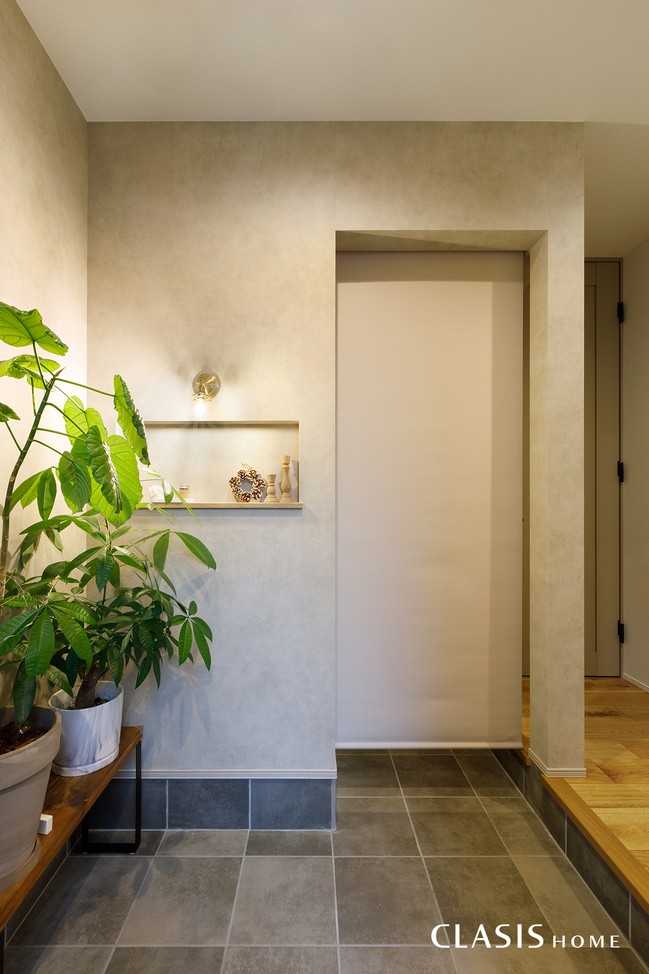 玄関正面には飾り棚とブラケット照明を配置し、空間のアクセントに。観葉植物を置いてもゆとりを感じられる広さを確保しました。ウォークスルータイプのシューズクロークはロールスクリーンで仕切ることで、急な来客時にもすっきりとした印象を保てるようにし、開けた際も空間に自然に収まるよう計画しました。
